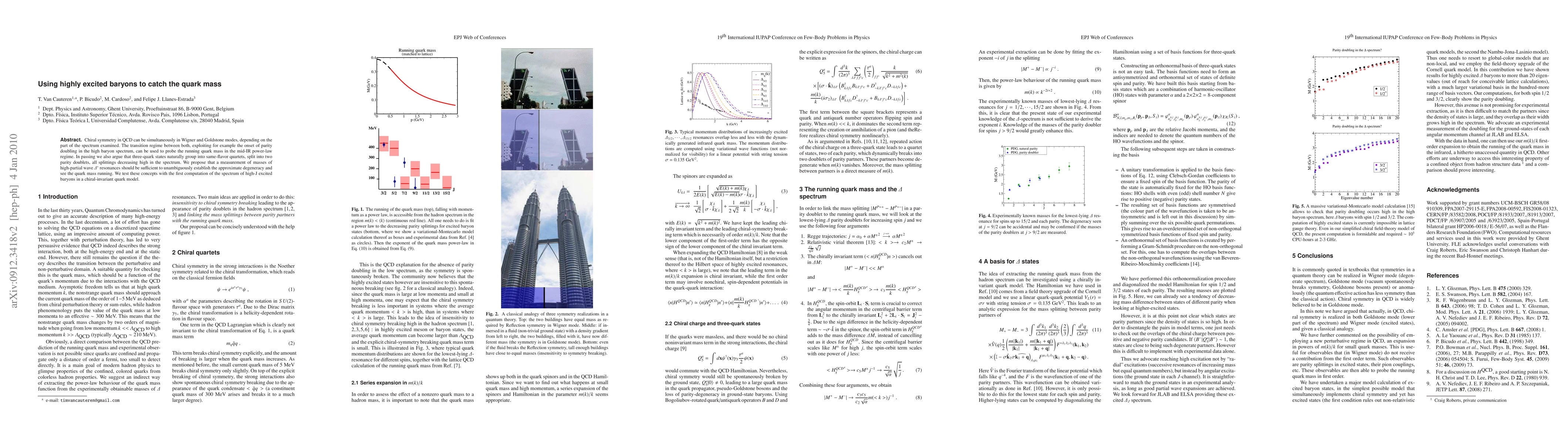 Chiral symmetry in QCD can be simultaneously in Wigner and Goldstone modes, depending on the part of the spectrum examined. The transition regime between both, exploiting for example the onset of parity doubling in the high baryon spectrum, can be used to probe the running quark mass in the mid-IR power-law regime. In passing we also argue that three-quark states naturally group into same-flavor quartets, split into two parity doublets, all splittings decreasing high in the spectrum. We propose that a measurement of masses of high-partial wave Delta* resonances should be sufficient to unambiguously establish the approximate degeneracy and see the quark mass running. We test these concepts with the first computation of the spectrum of high-J excited baryons in a chiral-invariant quark model.