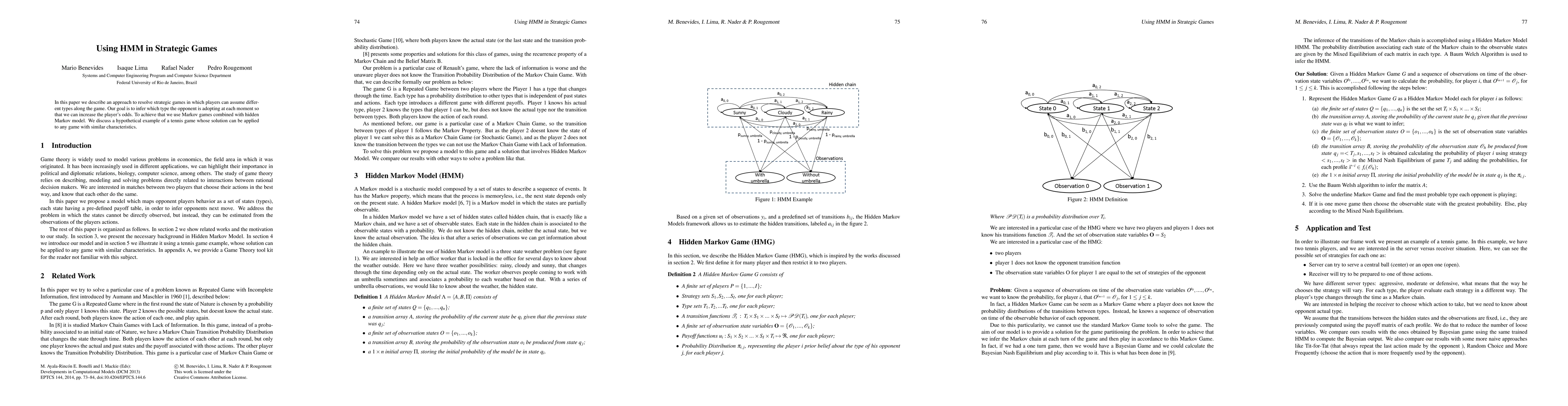 This paper proposes using hidden Markov models (HMM) in strategic games to infer opponents' types dynamically, enhancing player decision-making. It applies this approach to a tennis game example, demonstrating its potential for any similar strategic game.