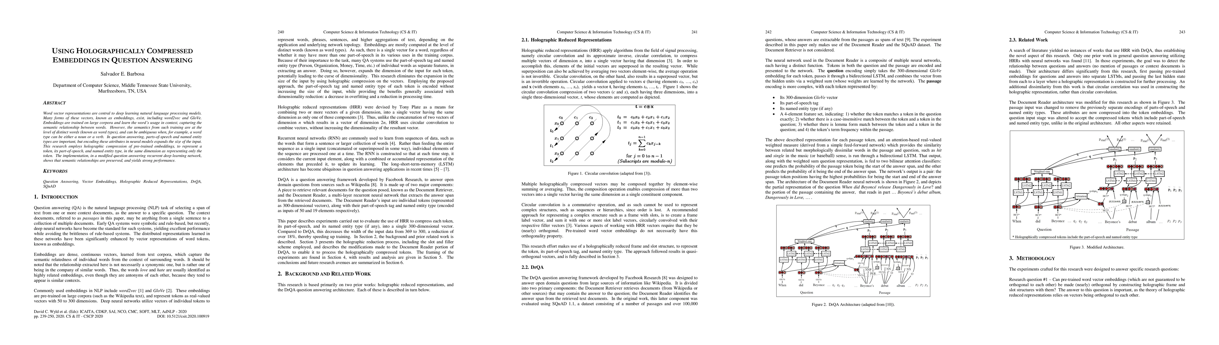 This research demonstrates the viability of holographically compressed token embeddings in deep learning for question answering, preserving semantic relationships while reducing input data width and speeding up training time.
