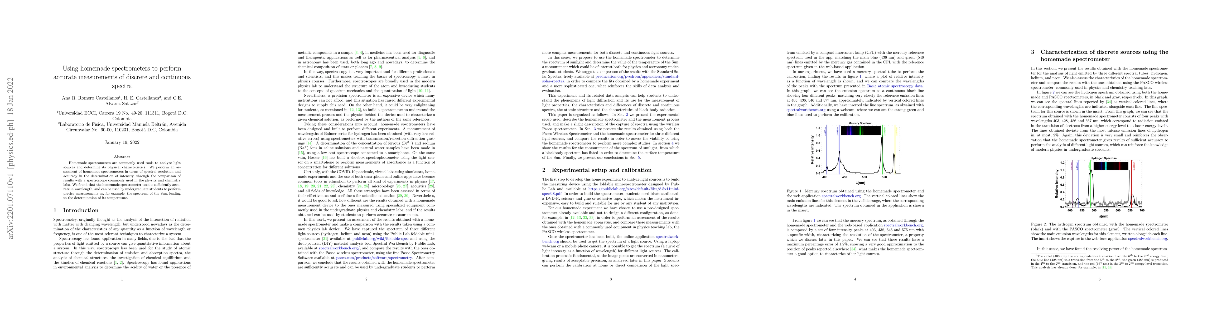 Summary: This study evaluates homemade spectrometers for their spectral resolution and accuracy in measuring light intensity, comparing them to a standard spectroscope. Results show that homemade spectrometers are sufficiently accurate for undergraduate students to use in precise measurements, such as determining the Sun's temperature from its spectrum.