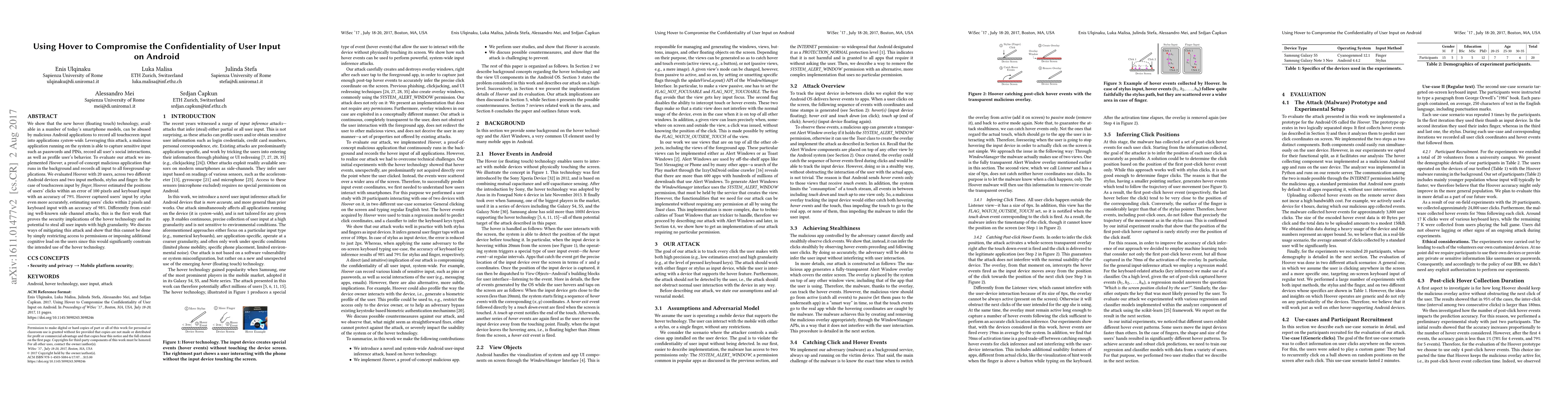 This paper demonstrates a security vulnerability in Android's hover technology, where malicious apps can record touchscreen input from other applications, capturing sensitive data like passwords and social interactions. The study implemented Hoover, a proof-of-concept app, which accurately estimated user input, especially with stylus, and discussed potential mitigations that do not compromise hover functionality.