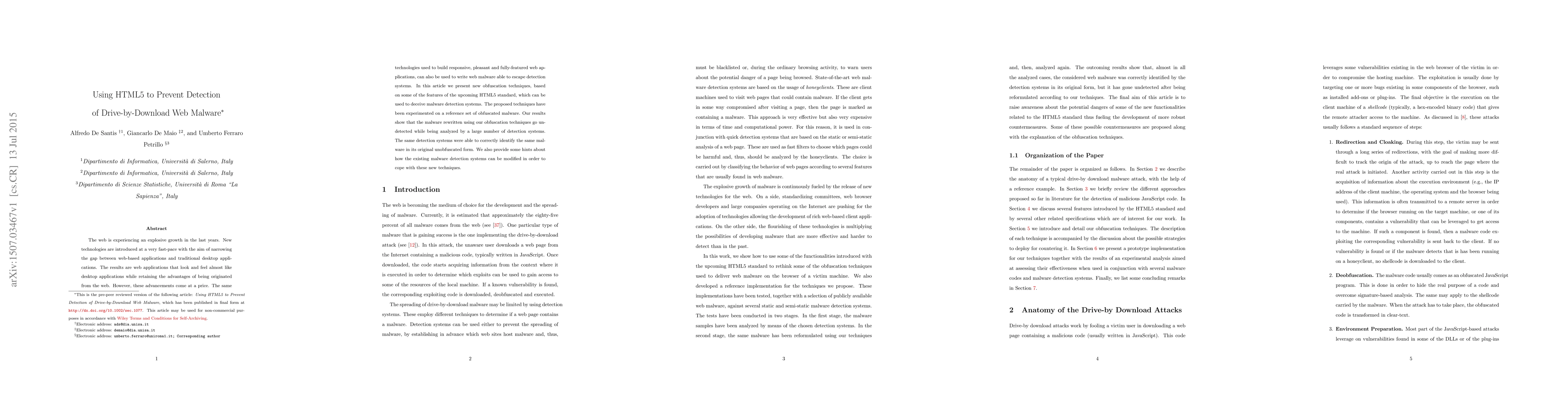 The web is experiencing an explosive growth in the last years. New technologies are introduced at a very fast-pace with the aim of narrowing the gap between web-based applications and traditional desktop applications. The results are web applications that look and feel almost like desktop applications while retaining the advantages of being originated from the web. However, these advancements come at a price. The same technologies used to build responsive, pleasant and fully-featured web applications, can also be used to write web malware able to escape detection systems. In this article we present new obfuscation techniques, based on some of the features of the upcoming HTML5 standard, which can be used to deceive malware detection systems. The proposed techniques have been experimented on a reference set of obfuscated malware. Our results show that the malware rewritten using our obfuscation techniques go undetected while being analyzed by a large number of detection systems. The same detection systems were able to correctly identify the same malware in its original unobfuscated form. We also provide some hints about how the existing malware detection systems can be modified in order to cope with these new techniques.