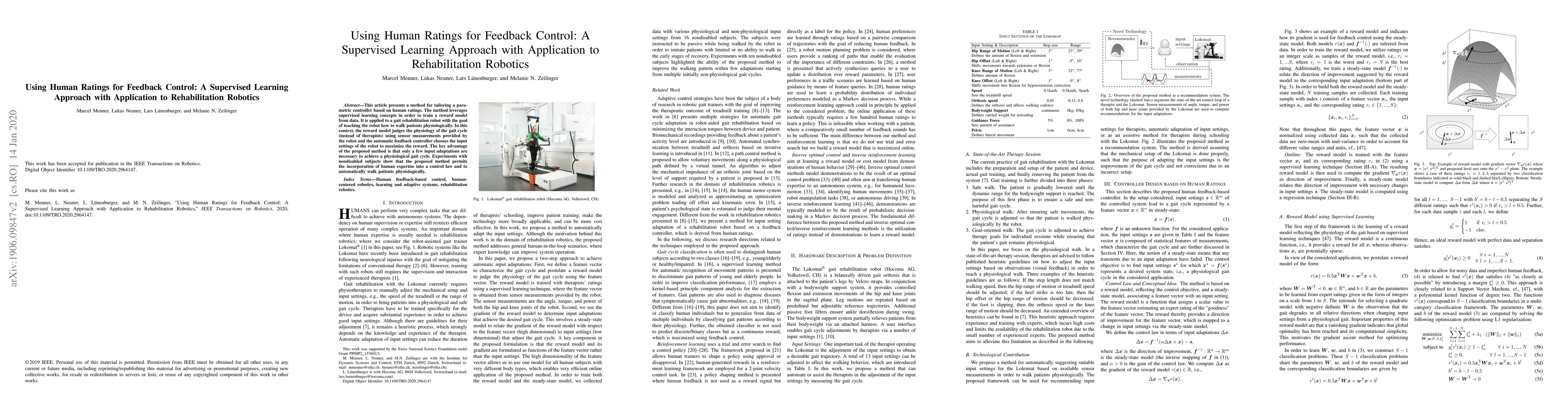 This paper presents a method for tailoring a parametric controller based on human ratings. The method leverages supervised learning concepts in order to train a reward model from data. It is applied to a gait rehabilitation robot with the goal of teaching the robot how to walk patients physiologically. In this context, the reward model judges the physiology of the gait cycle (instead of therapists) using sensor measurements provided by the robot and the automatic feedback controller chooses the input settings of the robot to maximize the reward. The key advantage of the proposed method is that only a few input adaptations are necessary to achieve a physiological gait cycle. Experiments with nondisabled subjects show that the proposed method permits the incorporation of human expertise into a control law and to automatically walk patients physiologically.