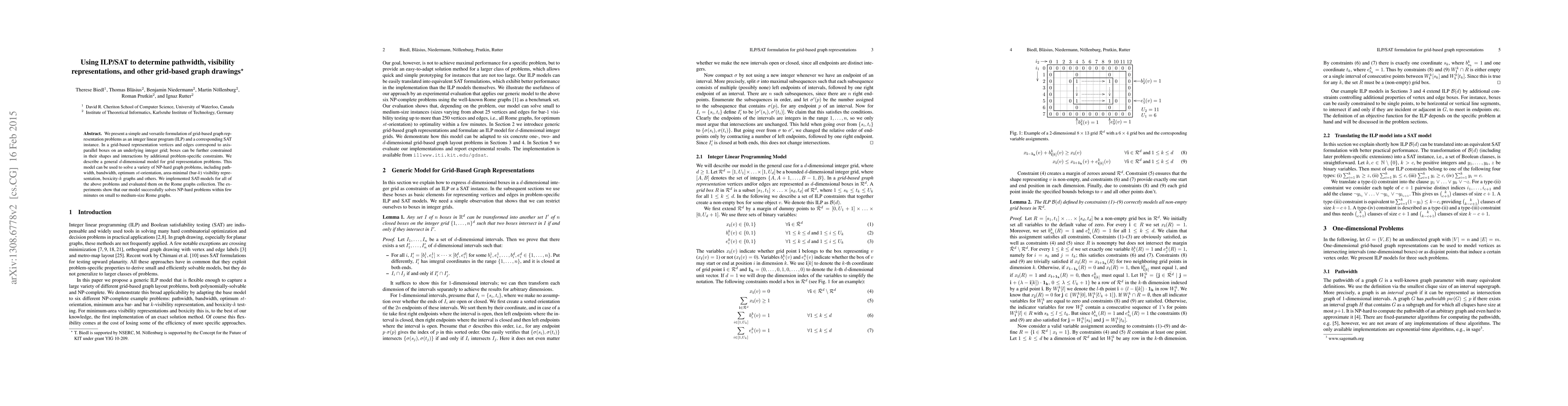We present a simple and versatile formulation of grid-based graph representation problems as an integer linear program (ILP) and a corresponding SAT instance. In a grid-based representation vertices and edges correspond to axis-parallel boxes on an underlying integer grid; boxes can be further constrained in their shapes and interactions by additional problem-specific constraints. We describe a general d-dimensional model for grid representation problems. This model can be used to solve a variety of NP-hard graph problems, including pathwidth, bandwidth, optimum st-orientation, area-minimal (bar-k) visibility representation, boxicity-k graphs and others. We implemented SAT-models for all of the above problems and evaluated them on the Rome graphs collection. The experiments show that our model successfully solves NP-hard problems within few minutes on small to medium-size Rome graphs.