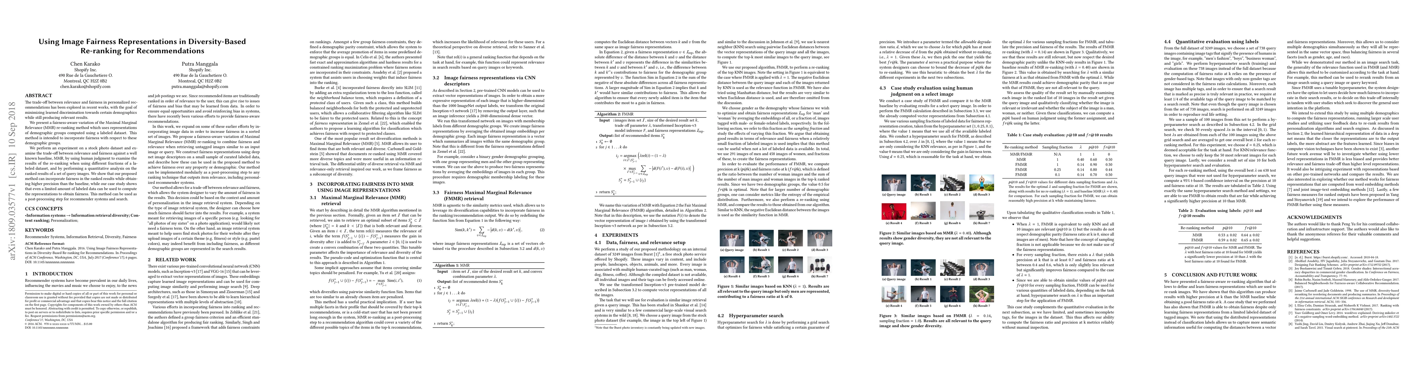 The trade-off between relevance and fairness in personalized recommendations has been explored in recent works, with the goal of minimizing learned discrimination towards certain demographics while still producing relevant results. We present a fairness-aware variation of the Maximal Marginal Relevance (MMR) re-ranking method which uses representations of demographic groups computed using a labeled dataset. This method is intended to incorporate fairness with respect to these demographic groups. We perform an experiment on a stock photo dataset and examine the trade-off between relevance and fairness against a well known baseline, MMR, by using human judgment to examine the results of the re-ranking when using different fractions of a labeled dataset, and by performing a quantitative analysis on the ranked results of a set of query images. We show that our proposed method can incorporate fairness in the ranked results while obtaining higher precision than the baseline, while our case study shows that even a limited amount of labeled data can be used to compute the representations to obtain fairness. This method can be used as a post-processing step for recommender systems and search.