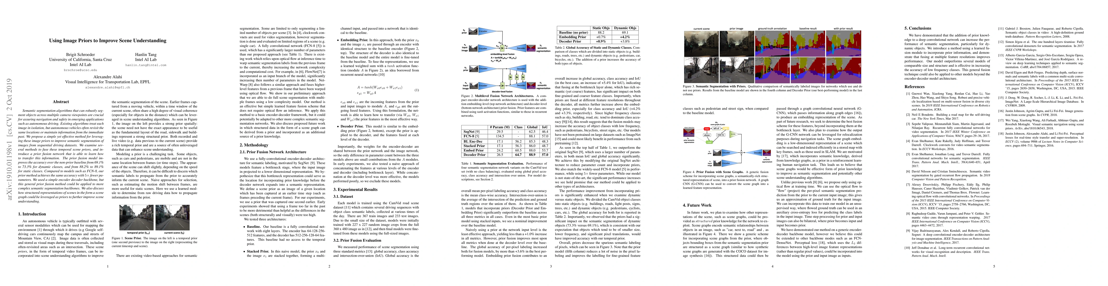 Semantic segmentation algorithms that can robustly segment objects across multiple camera viewpoints are crucial for assuring navigation and safety in emerging applications such as autonomous driving. Existing algorithms treat each image in isolation, but autonomous vehicles often revisit the same locations or maintain information from the immediate past. We propose a simple yet effective method for leveraging these image priors to improve semantic segmentation of images from sequential driving datasets. We examine several methods to fuse these temporal scene priors, and introduce a prior fusion network that is able to learn how to transfer this information. The prior fusion model improves the accuracy over the non-prior baseline from 69.1% to 73.3% for dynamic classes, and from 88.2% to 89.1% for static classes. Compared to models such as FCN-8, our prior method achieves the same accuracy with 5 times fewer parameters. We used a simple encoder decoder backbone, but this general prior fusion method could be applied to more complex semantic segmentation backbones. We also discuss how structured representations of scenes in the form of a scene graph could be leveraged as priors to further improve scene understanding.