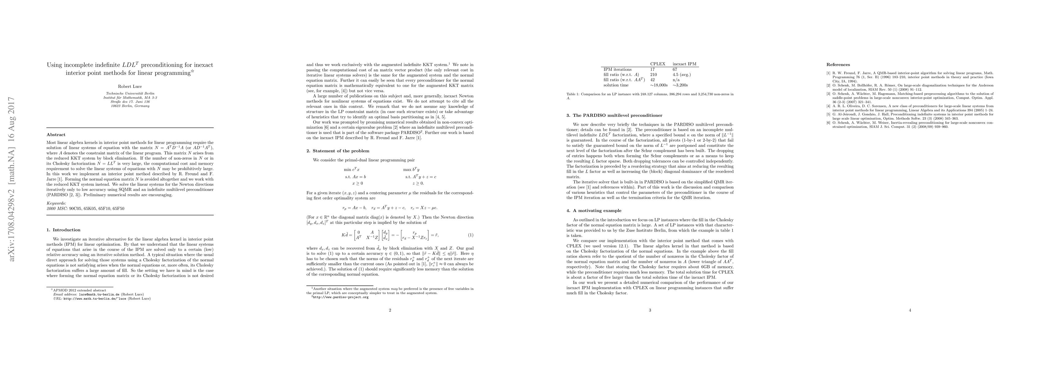 Most linear algebra kernels in interior point methods for linear programming require the solution of linear systems of equation with the matrix $N = A^TD^{-1}A$ (or $AD^{-1}A^T$), where $A$ denotes the constraint matrix of the linear program. This matrix $N$ arises from the reduced KKT system by block elimination. If the number of non-zeros in $N$ or in its Cholesky factorization $N= LL^T$ is very large, the computational cost and memory requirement to solve the linear systems of equations with $N$ may be prohibitively large. In this work we implement an interior point method described by R. Freund and F. Jarre. Forming the normal equation matrix $N$ is avoided altogether and we work with the reduced KKT system instead. We solve the linear systems for the Newton directions iteratively only to low accuracy using SQMR and an indefinite multilevel preconditioner. Preliminary numerical results are encouraging.