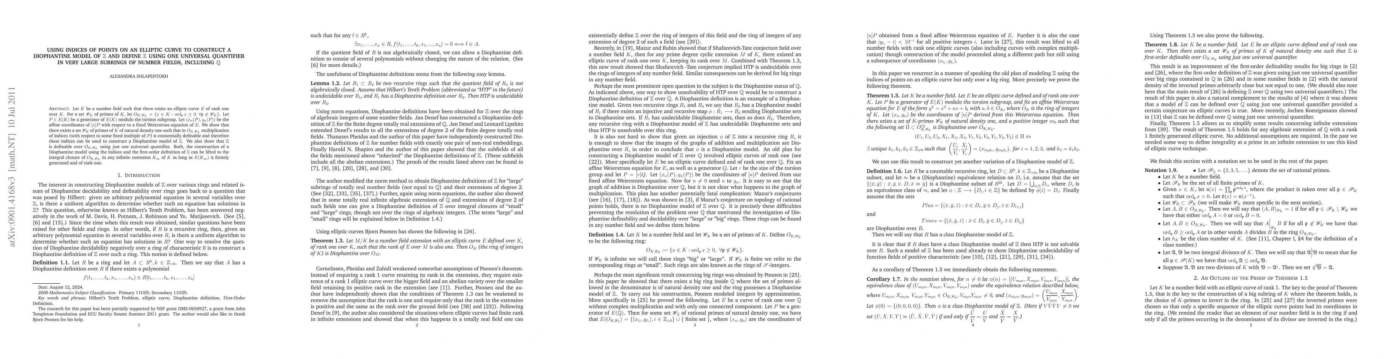 Let $K$ be a number field and let $E$ be an elliptic curve defined and of rank one over $K$. For a set $\calW_K$ of primes of $K$, let $O_{K,\calW_K}=\{x\in K: \ord_{\pp}x \geq 0, \forall \pp \not \in \calW_K\}$. Let $P \in E(K)$ be a generator of $E(K)$ modulo the torsion subgroup. Let $(x_n(P),y_n(P))$ be the affine coordinates of $[n]P$ with respect to a fixed Weierstrass equation of $E$. We show that there exists a set $\calW_K$ of primes of $K$ of natural density one such that in $O_{K,\calW_K}$ multiplication of indices (with respect to some fixed multiple of $P$) is existentially definable and therefore these indices can be used to construct a Diophantine model of $\Z$. We also show that $\Z$ is definable over $O_{K,\calW_K}$ using just one universal quantifier. Both, the construction of a Diophantine model using the indices and the first-order definition of $\Z$ can be lifted to the integral closure of $O_{K,\calW_K}$ in any infinite extension $K_{\infty}$ of $K$ as long as $E(K_{\infty})$ is finitely generated and of rank one.