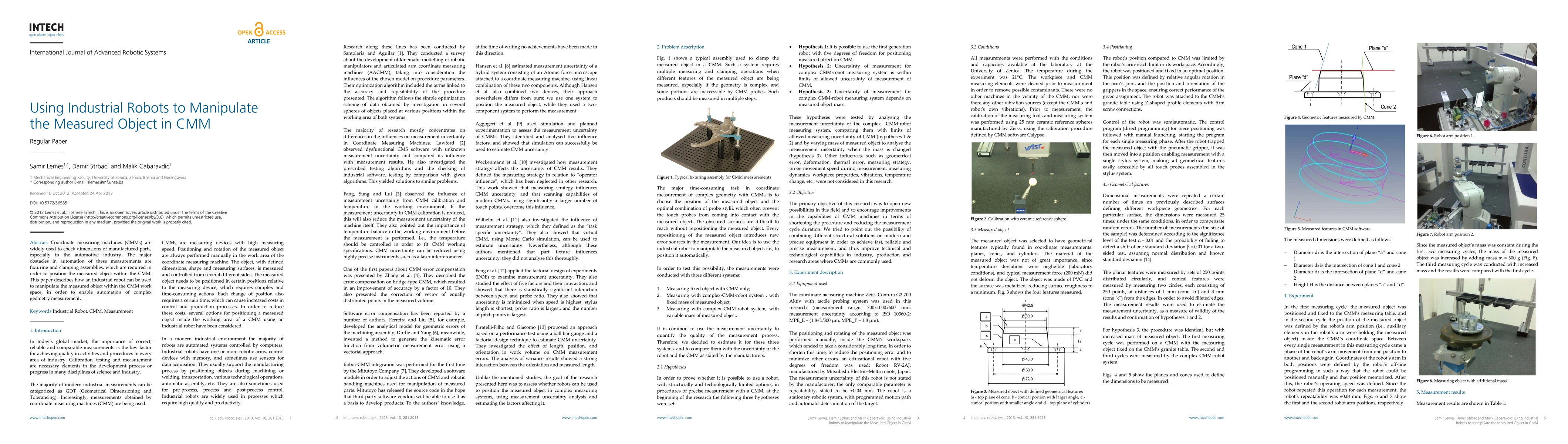 Coordinate measuring machines (CMMs) are widely used to check dimensions of manufactured parts, especially in automotive industry. The major obstacles in automation of these measurements are fixturing and clamping assemblies, which are required in order to position the measured object within the CMM. This paper describes how an industrial robot can be used to manipulate the measured object within the CMM work space, in order to enable automation of complex geometry measurement.