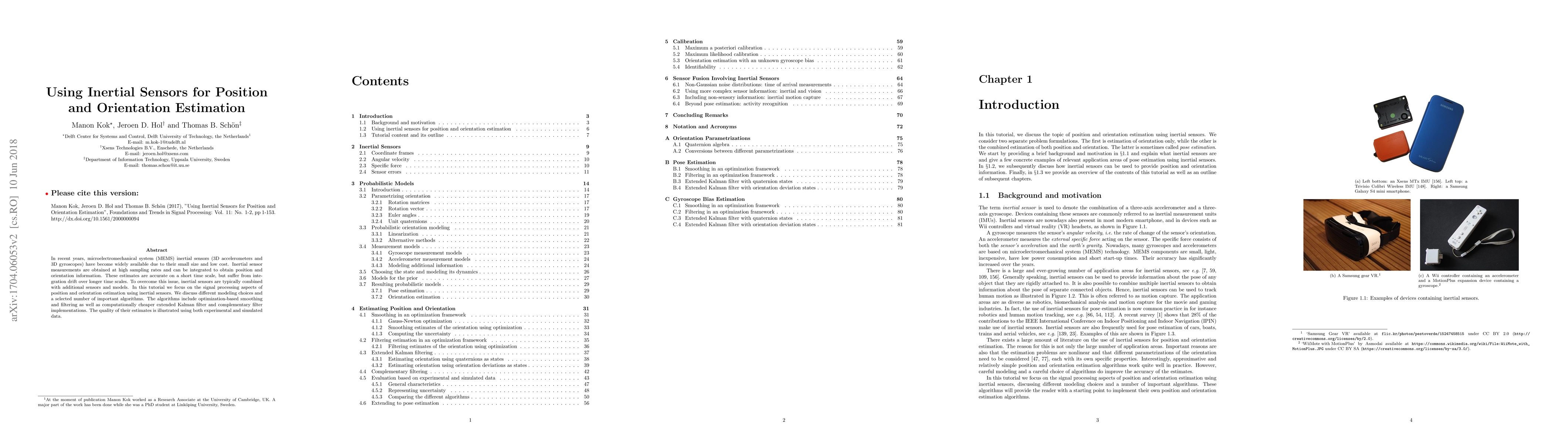 This paper explores the use of MEMS inertial sensors for estimating position and orientation, highlighting the challenges of integration drift. It discusses various algorithms, including optimization-based methods, extended Kalman filters, and complementary filters, and evaluates their performance using both simulated and experimental data.