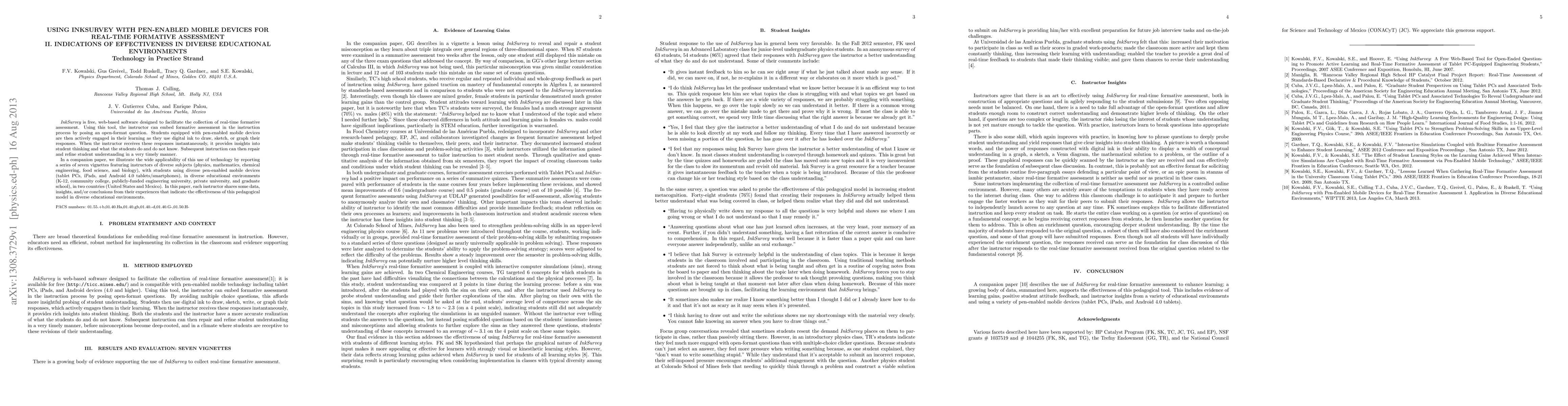 InkSurvey is free, web-based software designed to facilitate the collection of real-time formative assessment. Using this tool, the instructor can embed formative assessment in the instruction process by posing an open-format question. Students equipped with pen-enabled mobile devices are then actively engaged in their learning as they use digital ink to draw, sketch, or graph their responses. When the instructor receives these responses instantaneously, it provides insights into student thinking and what the students do and do not know. Subsequent instruction can then repair and refine student understanding in a very timely manner. In a companion paper, we illustrate the wide applicability of this use of technology by reporting a series of seven vignettes featuring instructors of diverse subjects (physics, mathematics, chemical engineering, food science, and biology), with students using diverse pen-enabled mobile devices (tablet PCs, iPads, and Android 4.0 tablets/smartphones), in diverse educational environments (K-12, community college, publicly-funded engineering university, private university, and graduate school), in two countries (United States and Mexico). In this paper, each instructor shares some data, insights, and/or conclusions from their experiences that indicate the effectiveness of this pedagogical model in diverse educational environments.