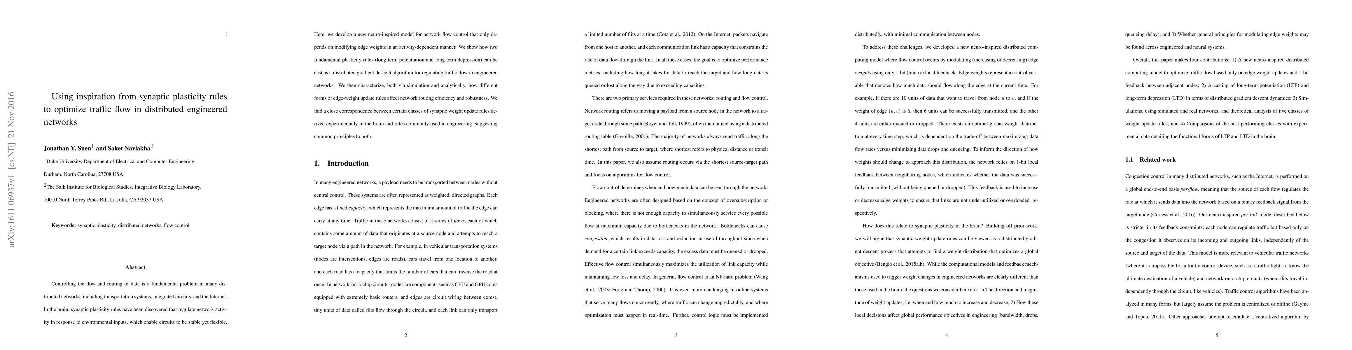 This paper proposes a neuro-inspired model for optimizing traffic flow in distributed networks by mimicking synaptic plasticity rules from the brain. It demonstrates how principles like long-term potentiation and long-term depression can regulate network routing efficiency and robustness through distributed gradient descent, revealing common principles between biological and engineered systems.