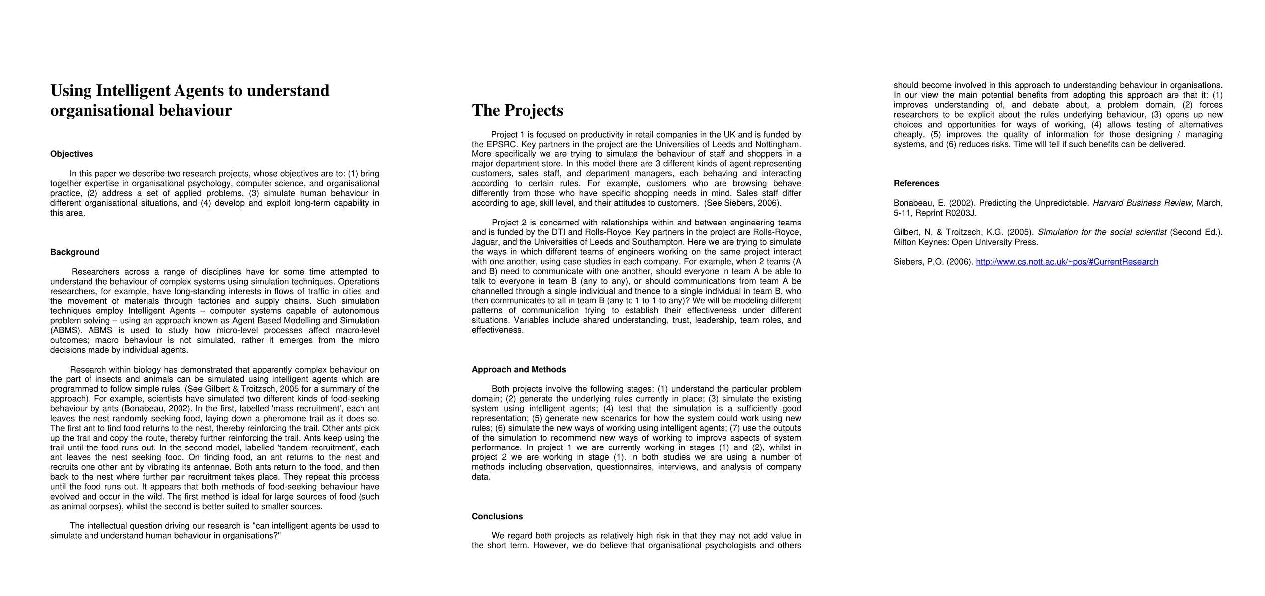 This paper introduces two ongoing research projects which seek to apply computer modelling techniques in order to simulate human behaviour within organisations. Previous research in other disciplines has suggested that complex social behaviours are governed by relatively simple rules which, when identified, can be used to accurately model such processes using computer technology. The broad objective of our research is to develop a similar capability within organisational psychology.