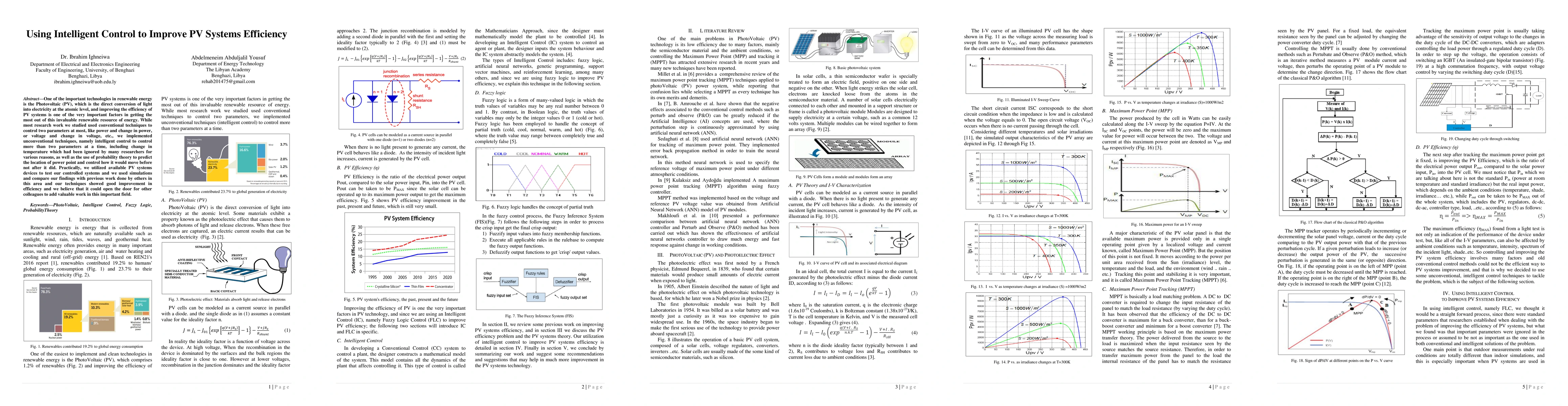 One of the important technologies in renewable energy is the Photovoltaic (PV), which is the direct conversion of light into electricity at the atomic level, and improving the efficiency of PV systems is one of the very important factors in getting the most out of this invaluable renewable resource of energy. While most research work we studied used conventional techniques to control two parameters at most, like power and change in power, or voltage and change in voltage, etc., we implemented unconventional techniques, namely intelligent control to control more than two parameters at a time, including change in temperature which had been ignored by many researchers for various reasons, as well as the use of probability theory to predict the location of power point and control how it would move before not after it did. Practically, we utilized available PV systems devices to test our controlled systems and we used simulations and compare our findings with previous work done by others in this area and our techniques showed good improvement in efficiency and we believe that it could open the door for other colleagues to add valuable work in this important field.