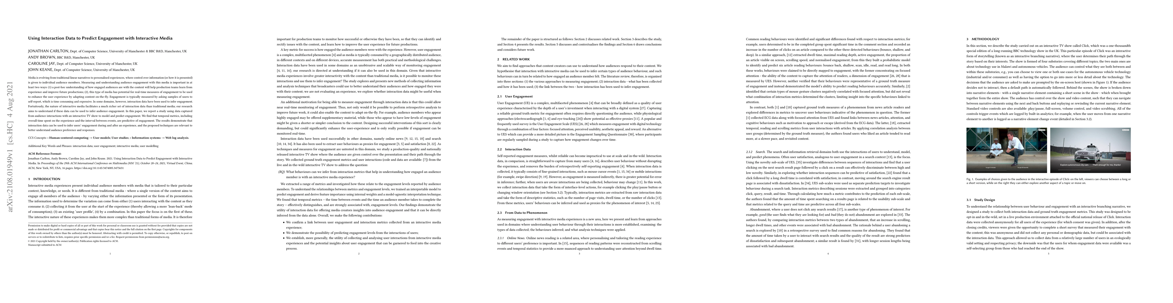 Media is evolving from traditional linear narratives to personalised experiences, where control over information (or how it is presented) is given to individual audience members. Measuring and understanding audience engagement with this media is important in at least two ways: (1) a post-hoc understanding of how engaged audiences are with the content will help production teams learn from experience and improve future productions; (2), this type of media has potential for real-time measures of engagement to be used to enhance the user experience by adapting content on-the-fly. Engagement is typically measured by asking samples of users to self-report, which is time consuming and expensive. In some domains, however, interaction data have been used to infer engagement. Fortuitously, the nature of interactive media facilitates a much richer set of interaction data than traditional media; our research aims to understand if these data can be used to infer audience engagement. In this paper, we report a study using data captured from audience interactions with an interactive TV show to model and predict engagement. We find that temporal metrics, including overall time spent on the experience and the interval between events, are predictive of engagement. The results demonstrate that interaction data can be used to infer users' engagement during and after an experience, and the proposed techniques are relevant to better understand audience preference and responses.