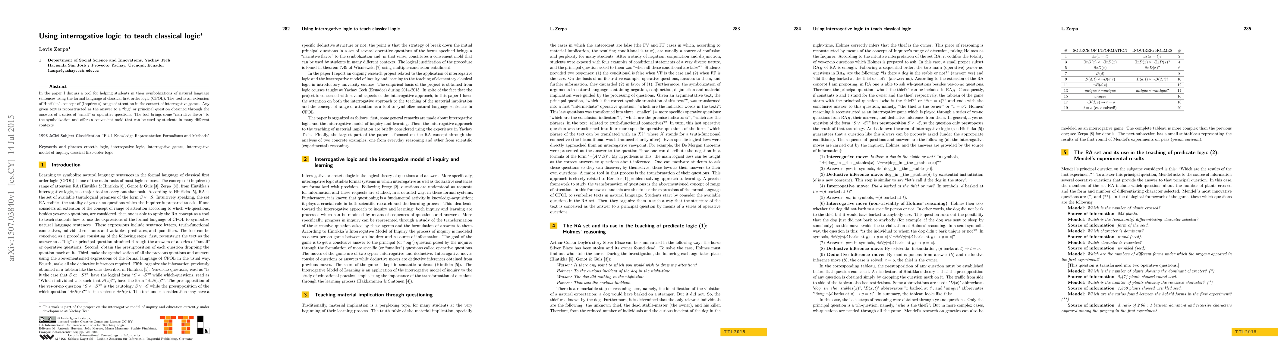 In the paper I discuss a tool for helping students in their symbolizations of natural language sentences using the formal language of classical first order logic (CFOL). The tool is an extension of Hintikka's concept of (Inquirer's) range of attention in the context of interrogative games. Any given text is reconstructed as the answer to a "big" or principal question obtained through the answers of a series of "small" or operative questions. The tool brings some "narrative flavor" to the symbolization and offers a convenient mold that can be used by students in many different contexts.