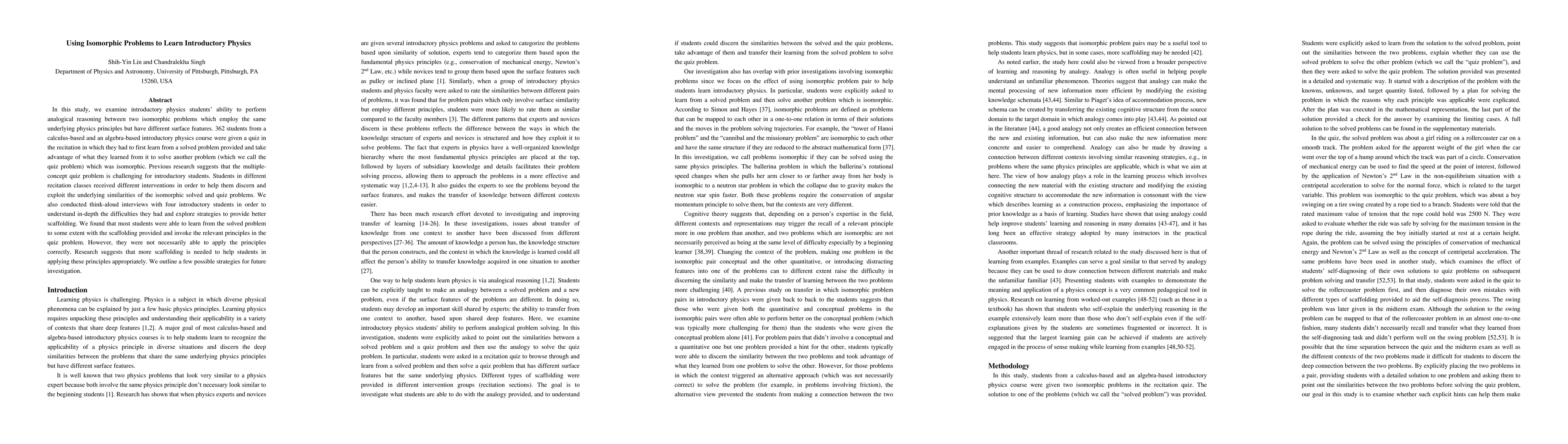 This study investigates introductory physics students' ability to use analogical reasoning to solve isomorphic problems, finding that while students can learn from solved examples, more scaffolding is needed to help them correctly apply underlying physics principles. Think-aloud interviews revealed areas for improvement in instructional strategies.