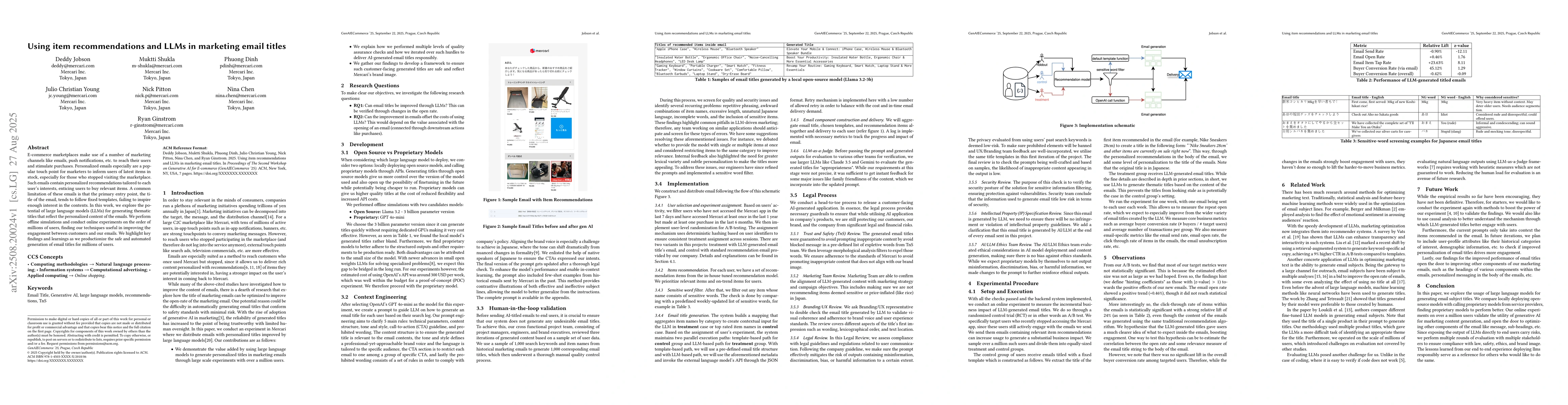 E-commerce marketplaces make use of a number of marketing channels like emails, push notifications, etc. to reach their users and stimulate purchases. Personalized emails especially are a popular touch point for marketers to inform users of latest items in stock, especially for those who stopped visiting the marketplace. Such emails contain personalized recommendations tailored to each user's interests, enticing users to buy relevant items. A common limitation of these emails is that the primary entry point, the title of the email, tends to follow fixed templates, failing to inspire enough interest in the contents. In this work, we explore the potential of large language models (LLMs) for generating thematic titles that reflect the personalized content of the emails. We perform offline simulations and conduct online experiments on the order of millions of users, finding our techniques useful in improving the engagement between customers and our emails. We highlight key findings and learnings as we productionize the safe and automated generation of email titles for millions of users.