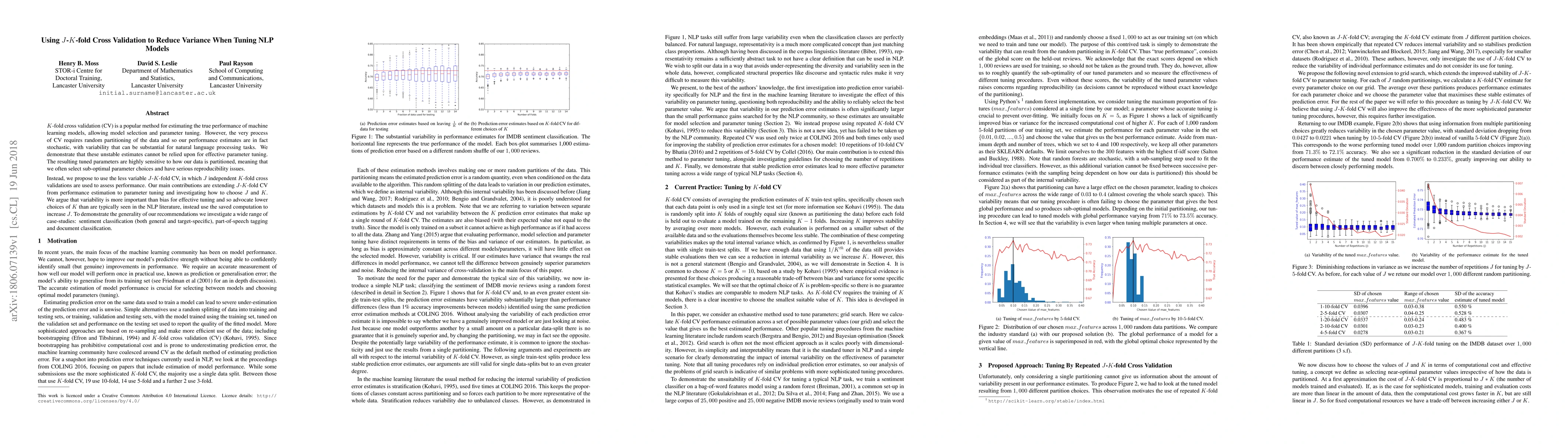 This paper proposes using J-K fold cross validation to reduce variance in tuning NLP models, arguing that traditional K-fold CV leads to unreliable performance estimates due to data partitioning variability. The authors suggest employing multiple independent K-fold cross validations to achieve more stable parameter tuning and better reproducibility.