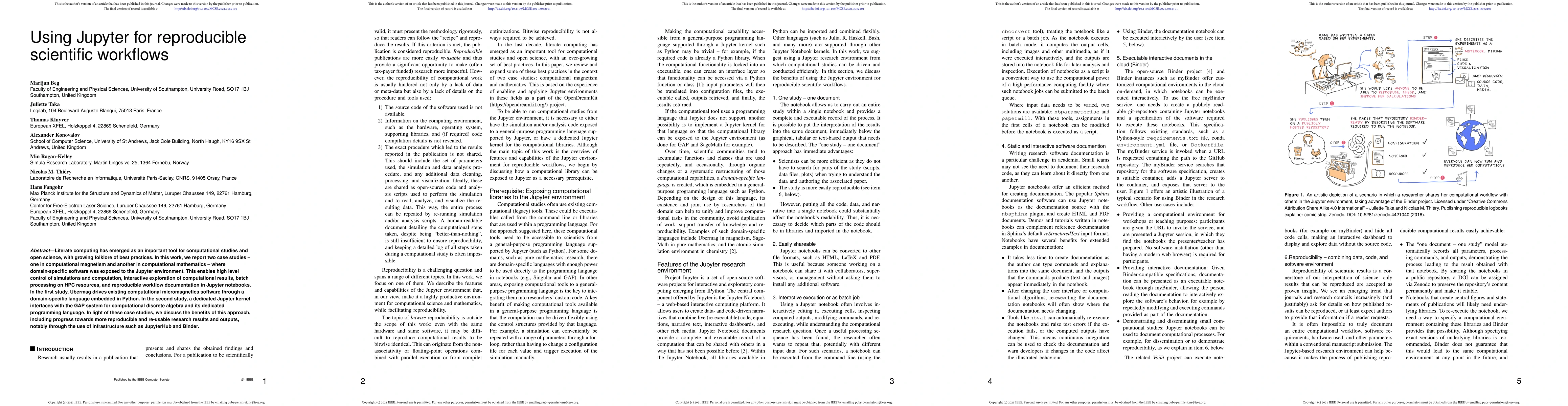 This paper explores the use of Jupyter for enhancing reproducibility in scientific workflows, showcasing two case studies in computational magnetism and mathematics. It highlights the integration of domain-specific software with Jupyter for interactive simulations, batch processing, and reproducible documentation.