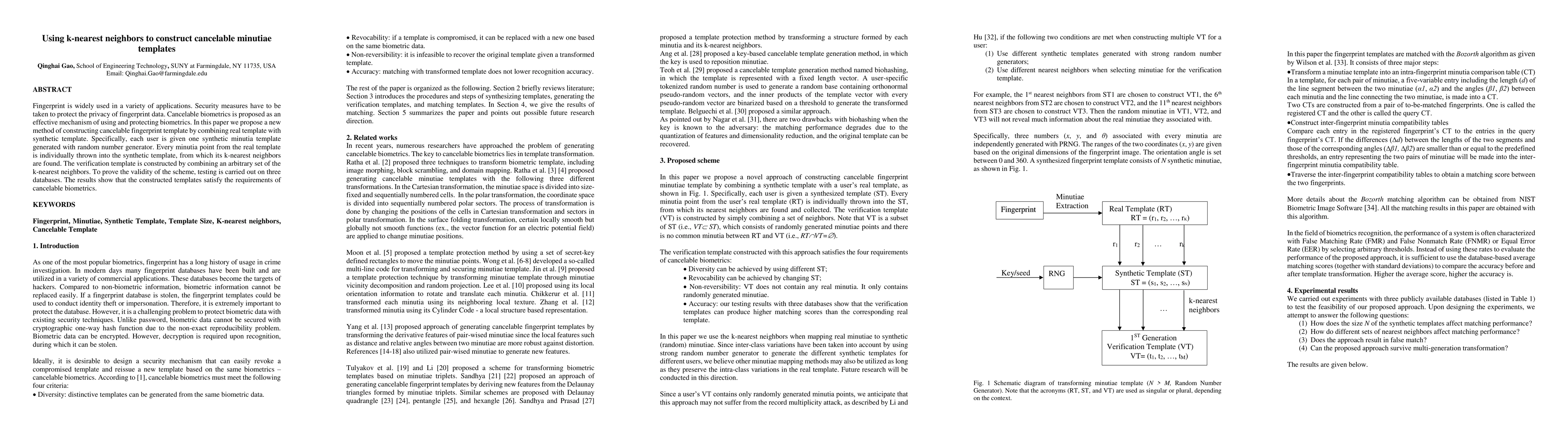 This paper proposes a new method for constructing cancelable fingerprint templates using k-nearest neighbors (k-NN) to combine real and synthetic minutiae templates. Testing on three databases demonstrates the effectiveness of the method in meeting cancelable biometrics requirements.