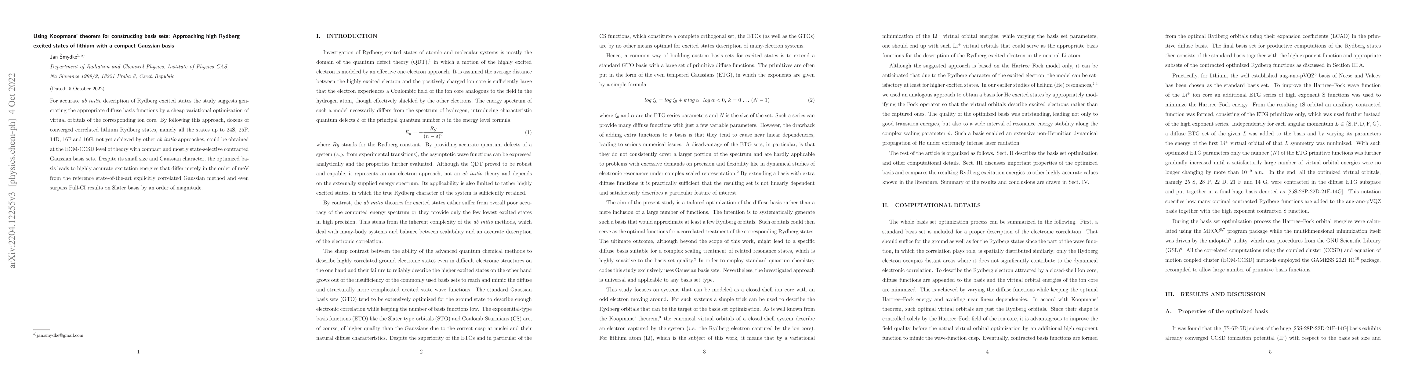 This paper proposes a method using Koopmans' theorem to construct compact Gaussian basis sets for accurately describing high Rydberg excited states of lithium. The approach enables the convergence of dozens of lithium Rydberg states, achieving results comparable to state-of-the-art methods with significantly smaller basis sets.
