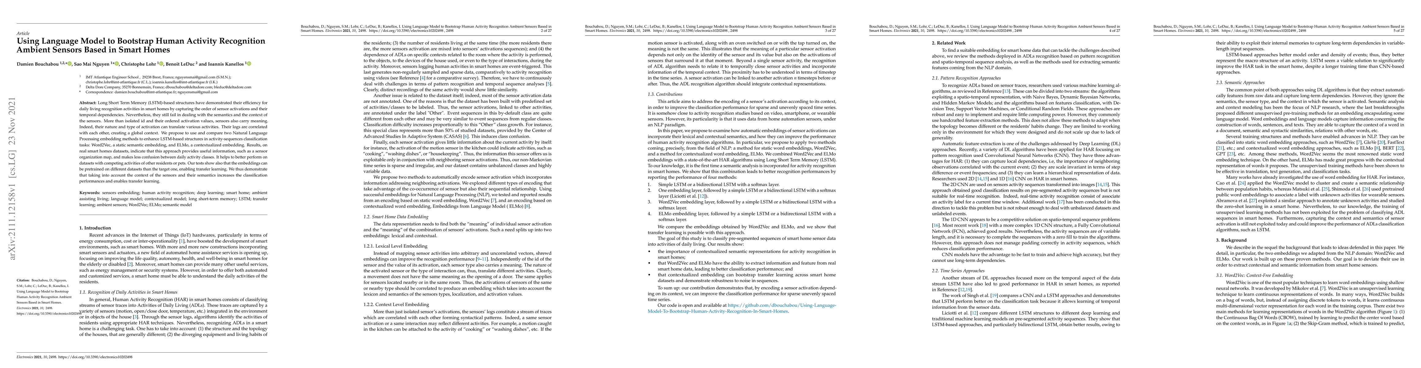 This paper proposes using Natural Language Processing (NLP) embeddings, Word2Vec and ELMo, to enhance LSTM-based models for human activity recognition in smart homes. The approach improves classification performance by incorporating sensor semantics and context, enabling better handling of competing activities and transfer learning.