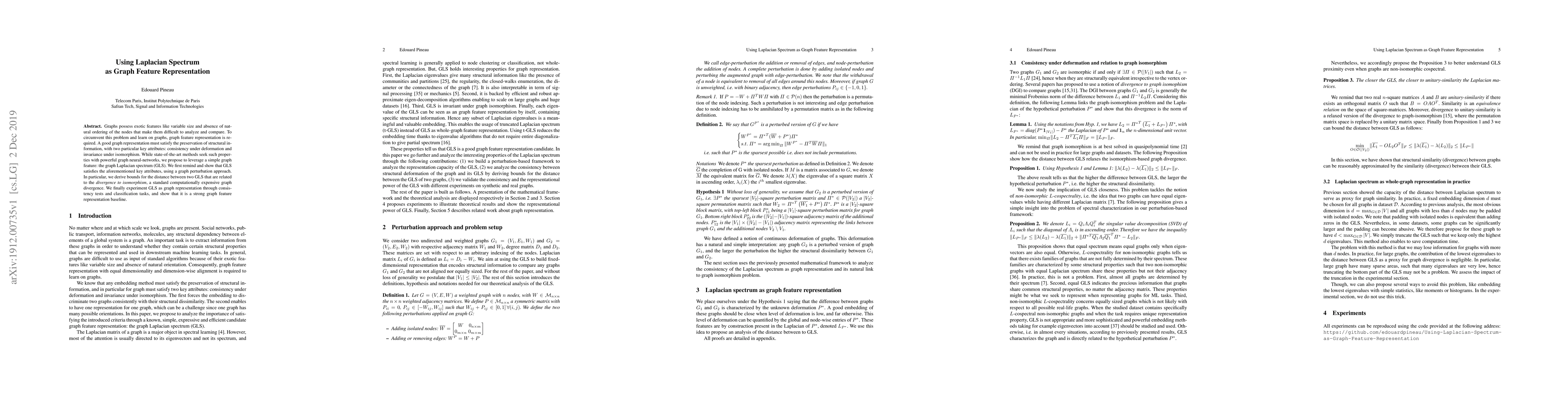 Graphs possess exotic features like variable size and absence of natural ordering of the nodes that make them difficult to analyze and compare. To circumvent this problem and learn on graphs, graph feature representation is required. A good graph representation must satisfy the preservation of structural information, with two particular key attributes: consistency under deformation and invariance under isomorphism. While state-of-the-art methods seek such properties with powerful graph neural-networks, we propose to leverage a simple graph feature: the graph Laplacian spectrum (GLS). We first remind and show that GLS satisfies the aforementioned key attributes, using a graph perturbation approach. In particular, we derive bounds for the distance between two GLS that are related to the \textit{divergence to isomorphism}, a standard computationally expensive graph divergence. We finally experiment GLS as graph representation through consistency tests and classification tasks, and show that it is a strong graph feature representation baseline.