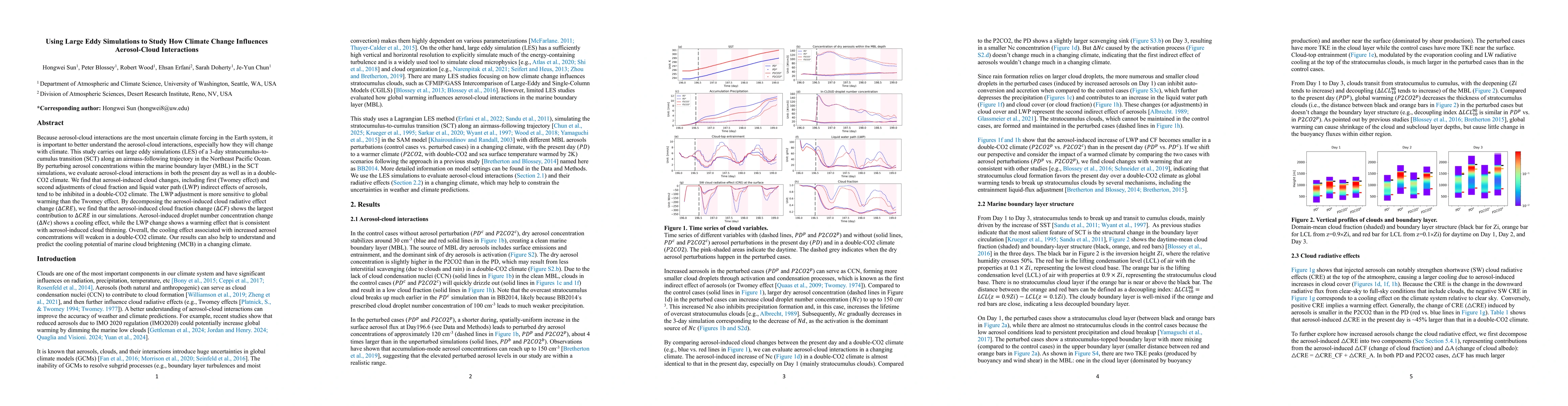 Because aerosol-cloud interactions are the most uncertain climate forcing in the Earth system, it is important to better understand the aerosol-cloud interactions, especially how they will change with climate. This study carries out large eddy simulations (LES) of a 3-day stratocumulus-to-cumulus transition (SCT) along an airmass-following trajectory in the Northeast Pacific Ocean. By perturbing aerosol concentrations within the marine boundary layer (MBL) in the SCT simulations, we evaluate aerosol-cloud interactions in both the present day as well as in a double-CO2 climate. We find that aerosol-induced cloud changes, including first (Twomey effect) and second adjustments of cloud fraction and liquid water path (LWP) indirect effects of aerosols, tend to be inhibited in a double-CO2 climate. The LWP adjustment is more sensitive to global warming than the Twomey effect. By decomposing the aerosol-induced cloud radiative effect change ($\Delta$CRE), we find that the aerosol-induced cloud fraction change ($\Delta$CF) shows the largest contribution to $\Delta$CRE in our simulations. Aerosol-induced droplet number concentration change ($\Delta$Nc) shows a cooling effect, while the LWP change shows a warming effect that is consistent with aerosol-induced cloud thinning. Overall, the cooling effect associated with increased aerosol concentrations will weaken in a double-CO2 climate. Our results can also help to understand and predict the cooling potential of marine cloud brightening (MCB) in a changing climate.