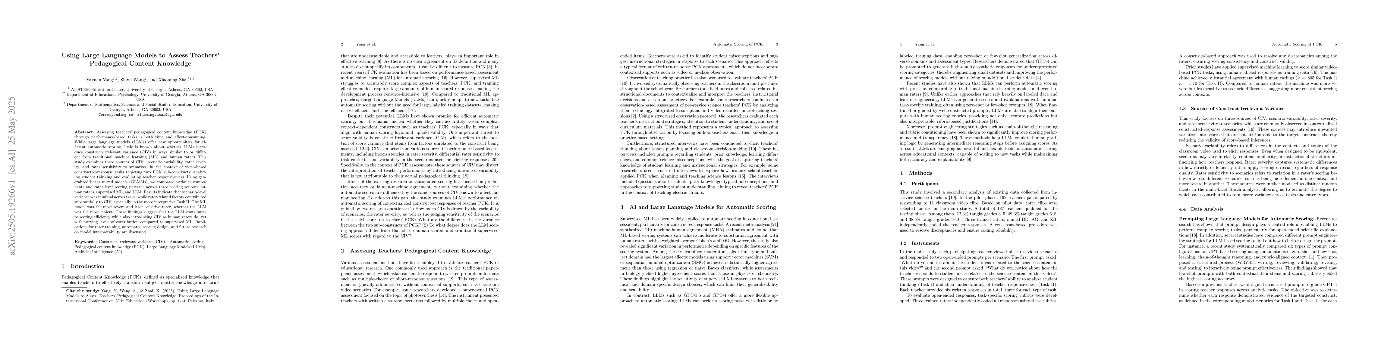 This work distinguishes itself by examining construct-irrelevant variance in LLM-based teacher PCK assessment, comparing it to human raters and supervised ML, and discussing implications for rater training and automated scoring design.