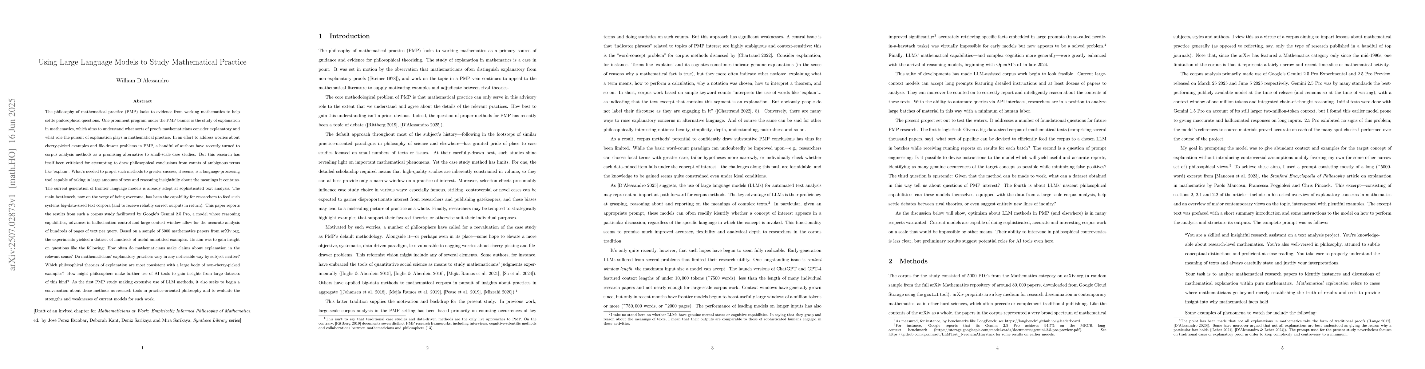 The philosophy of mathematical practice (PMP) looks to evidence from working mathematics to help settle philosophical questions. One prominent program under the PMP banner is the study of explanation in mathematics, which aims to understand what sorts of proofs mathematicians consider explanatory and what role the pursuit of explanation plays in mathematical practice. In an effort to address worries about cherry-picked examples and file-drawer problems in PMP, a handful of authors have recently turned to corpus analysis methods as a promising alternative to small-scale case studies. This paper reports the results from such a corpus study facilitated by Google's Gemini 2.5 Pro, a model whose reasoning capabilities, advances in hallucination control and large context window allow for the accurate analysis of hundreds of pages of text per query. Based on a sample of 5000 mathematics papers from arXiv.org, the experiments yielded a dataset of hundreds of useful annotated examples. Its aim was to gain insight on questions like the following: How often do mathematicians make claims about explanation in the relevant sense? Do mathematicians' explanatory practices vary in any noticeable way by subject matter? Which philosophical theories of explanation are most consistent with a large body of non-cherry-picked examples? How might philosophers make further use of AI tools to gain insights from large datasets of this kind? As the first PMP study making extensive use of LLM methods, it also seeks to begin a conversation about these methods as research tools in practice-oriented philosophy and to evaluate the strengths and weaknesses of current models for such work.