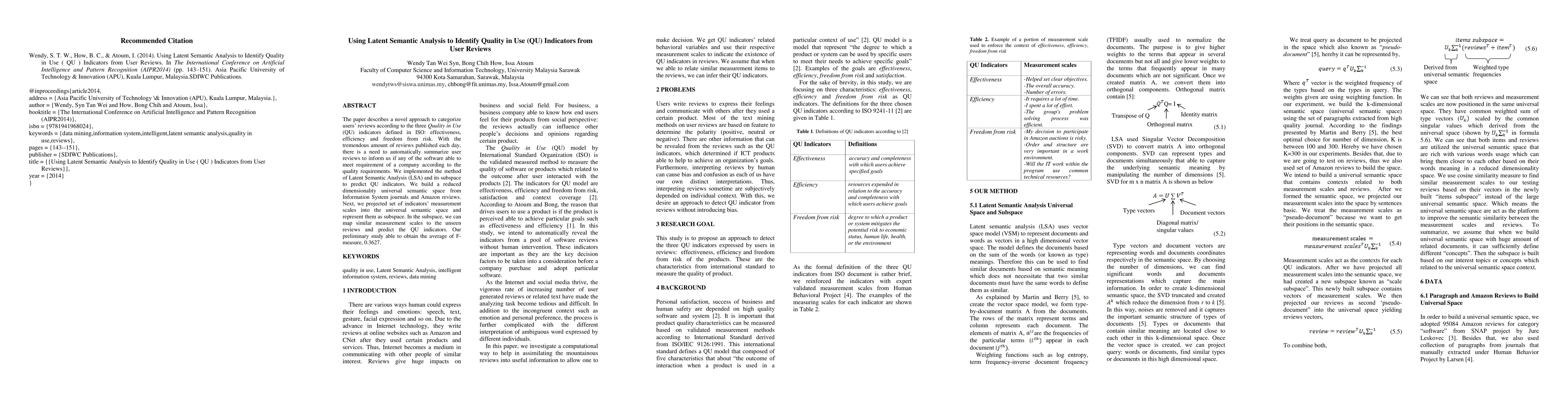 The paper describes a novel approach to categorize users' reviews according to the three Quality in Use (QU) indicators defined in ISO: effectiveness, efficiency and freedom from risk. With the tremendous amount of reviews published each day, there is a need to automatically summarize user reviews to inform us if any of the software able to meet requirement of a company according to the quality requirements. We implemented the method of Latent Semantic Analysis (LSA) and its subspace to predict QU indicators. We build a reduced dimensionality universal semantic space from Information System journals and Amazon reviews. Next, we projected set of indicators' measurement scales into the universal semantic space and represent them as subspace. In the subspace, we can map similar measurement scales to the unseen reviews and predict the QU indicators. Our preliminary study able to obtain the average of F-measure, 0.3627.