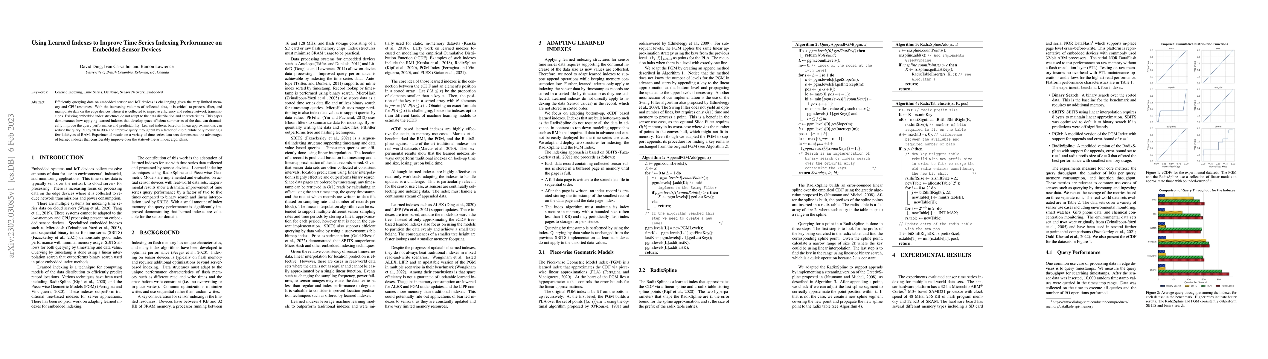 Efficiently querying data on embedded sensor and IoT devices is challenging given the very limited memory and CPU resources. With the increasing volumes of collected data, it is critical to process, filter, and manipulate data on the edge devices where it is collected to improve efficiency and reduce network transmissions. Existing embedded index structures do not adapt to the data distribution and characteristics. This paper demonstrates how applying learned indexes that develop space efficient summaries of the data can dramatically improve the query performance and predictability. Learned indexes based on linear approximations can reduce the query I/O by 50 to 90% and improve query throughput by a factor of 2 to 5, while only requiring a few kilobytes of RAM. Experimental results on a variety of time series data sets demonstrate the advantages of learned indexes that considerably improve over the state-of-the-art index algorithms.