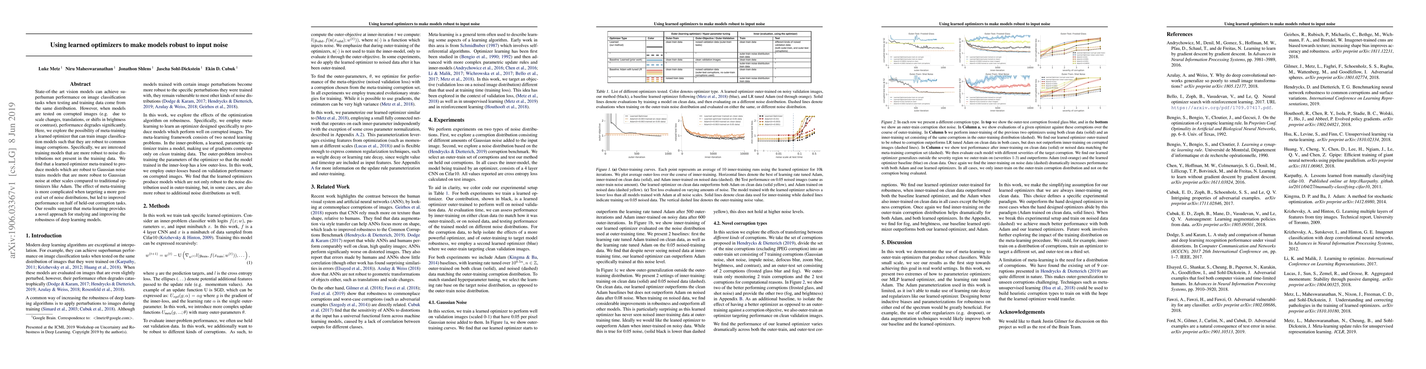This research introduces a learned optimizer that enhances image classification model robustness to image corruptions not seen during training, such as scale changes, translations, or brightness/contrast shifts. Meta-training the optimizer with Gaussian noise results in improved robustness to various Gaussian noise scales compared to traditional optimizers like Adam. The method shows promise, improving performance on half of unseen corruption tasks, suggesting a novel approach for boosting deep learning model robustness.