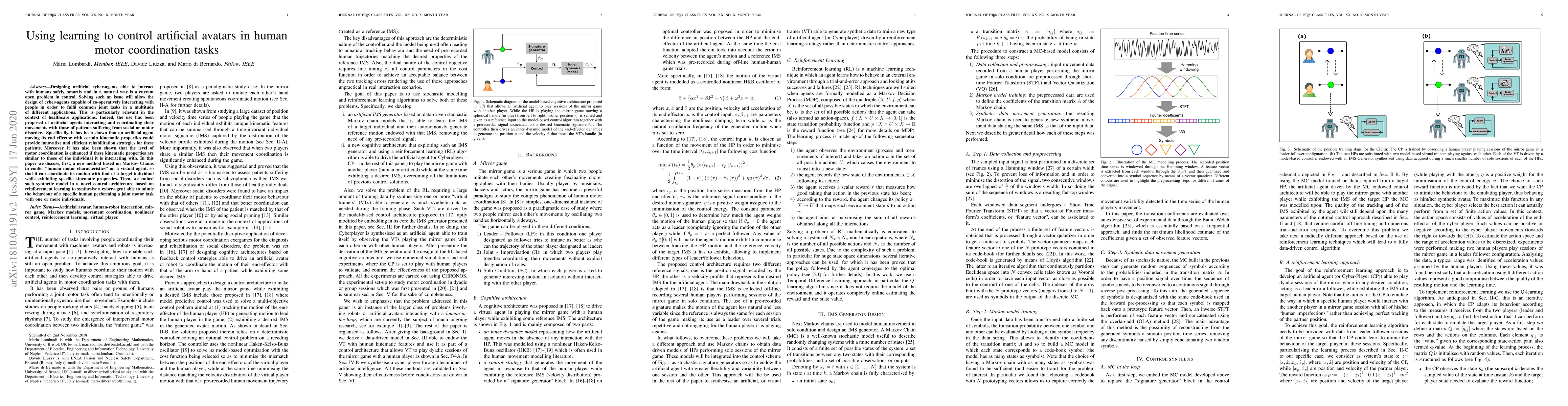 Designing artificial cyber-agents able to interact with human safely, smartly and in a natural way is a current open problem in control. Solving such an issue will allow the design of cyber-agents capable of co-operatively interacting with people in order to fulfil common joint tasks in a multitude of different applications. This is particularly relevant in the context of healthcare applications. Indeed, the use has been proposed of artificial agents interacting and coordinating their movements with those of a patient suffering from social or motor disorders. Specifically, it has been shown that an artificial agent exhibiting certain kinematic properties could provide innovative and efficient rehabilitation strategies for these patients. Moreover, it has also been shown that the level of motor coordination is enhanced if these kinematic properties are similar to those of the individual it is interacting with. In this paper we discuss, first, a new method based on Markov Chains to confer "human motor characteristics" on a virtual agent, so as that it can coordinate its motion with that of a target individual while exhibiting specific kinematic properties. Then, we embed such synthetic model in a control architecture based on reinforcement learning to synthesize a cyber-agent able to mimic the behaviour of a specific human performing a joint motor task with one or more individuals.