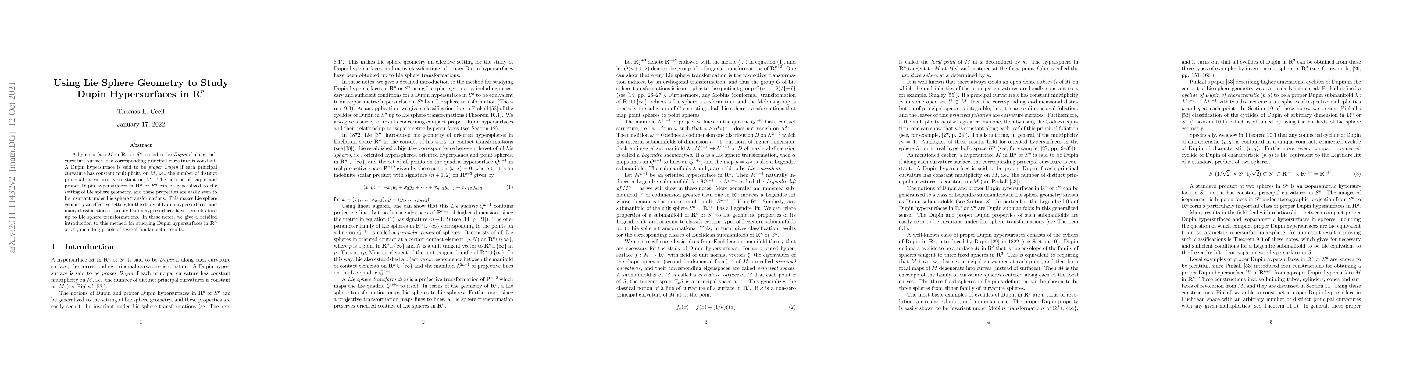 This paper uses Lie sphere geometry to study Dupin hypersurfaces in ${\bf R}^n$ and $S^n$, providing detailed methods and classifications of proper Dupin hypersurfaces invariant under Lie sphere transformations. The study highlights fundamental properties and results of Dupin hypersurfaces.
