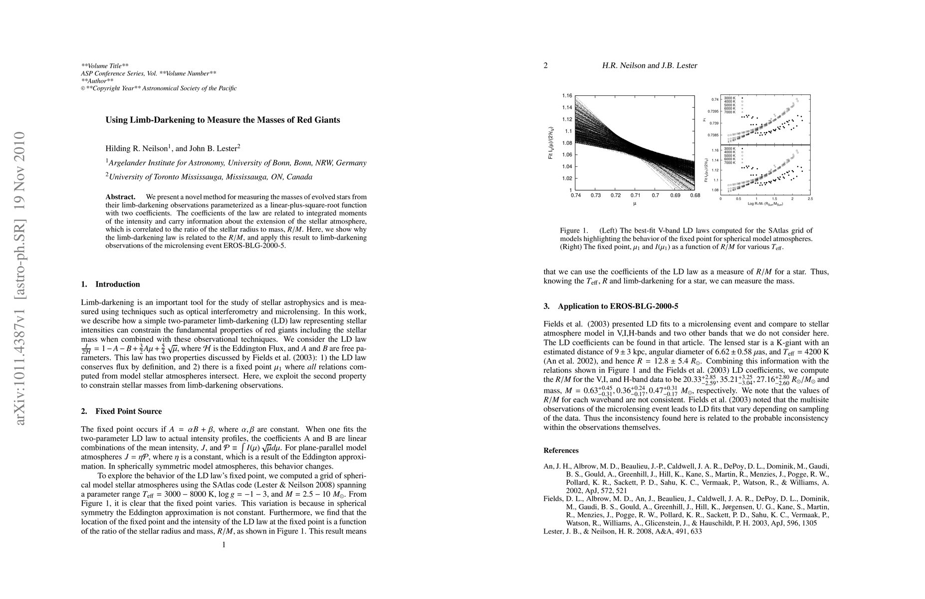 This paper introduces a new method for determining the masses of red giants using limb-darkening observations, showing that limb-darkening coefficients correlate with the ratio of the star's radius to mass (R/M). The method is demonstrated through analysis of the microlensing event EROS-BLG-2000-5.