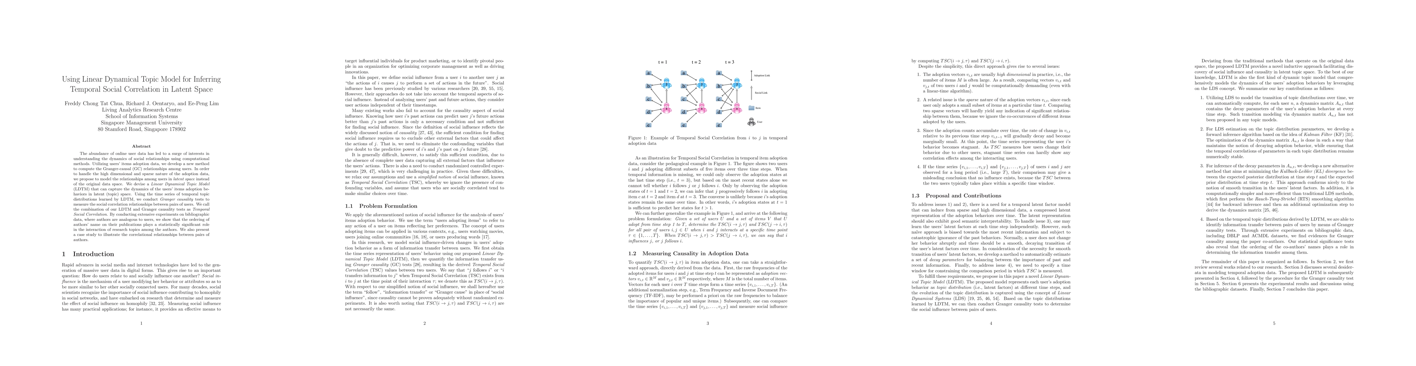 This paper proposes a Linear Dynamical Topic Model (LDTM) to infer Granger-causal relationships among users based on their items adoption data, modeling social correlations in latent space. Experiments on bibliographic data demonstrate significant social interaction dynamics among authors, highlighting the impact of authorship order on research topic interactions.