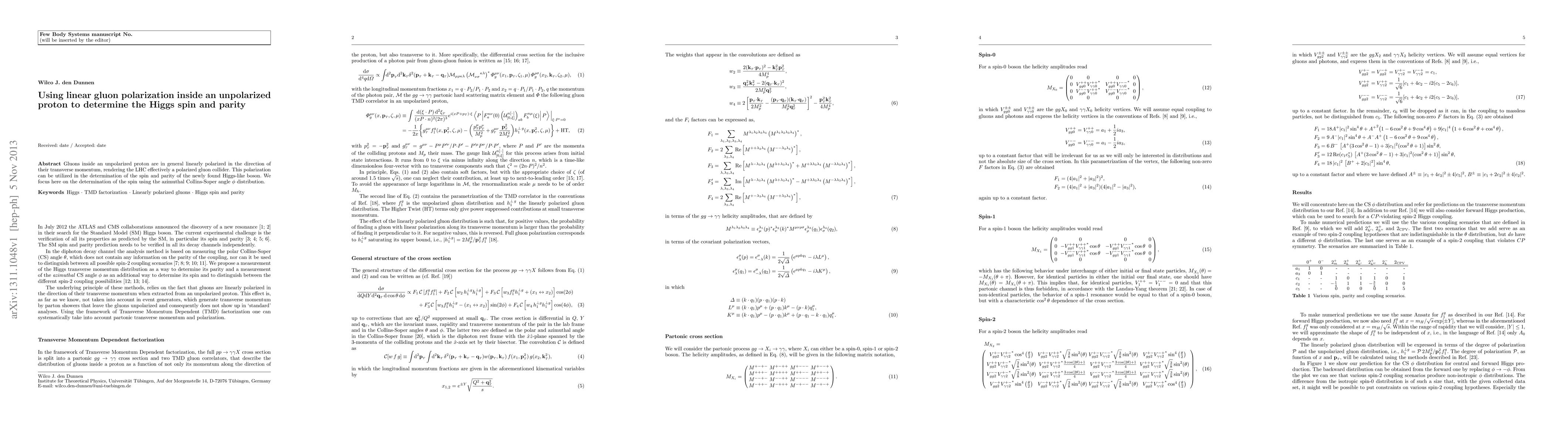 This paper explores using the linear polarization of gluons inside an unpolarized proton at the LHC to determine the spin of the Higgs-like boson. It specifically examines the azimuthal Collins-Soper angle $\phi$ distribution for this purpose.