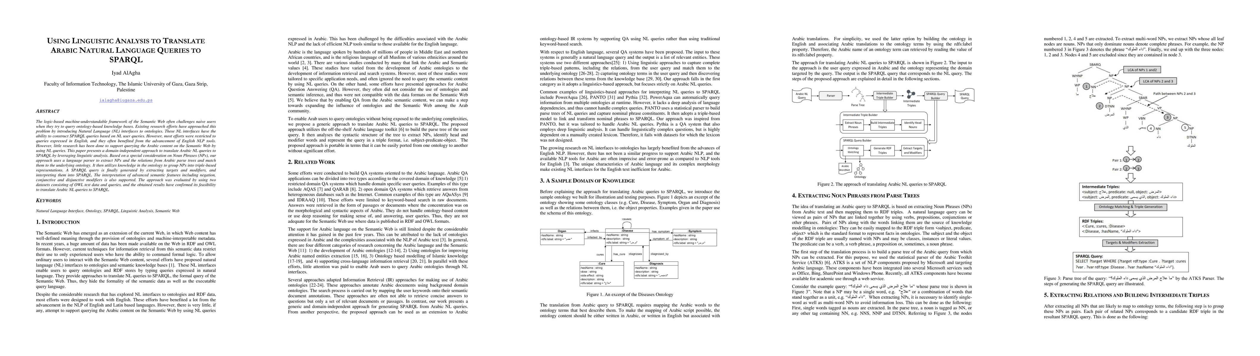 This paper proposes a domain-independent method to translate Arabic natural language queries into SPARQL by leveraging linguistic analysis, focusing on Noun Phrases to generate triple-based representations and generate SPARQL queries, with support for advanced semantic features. Evaluation using OWL datasets confirms its effectiveness.