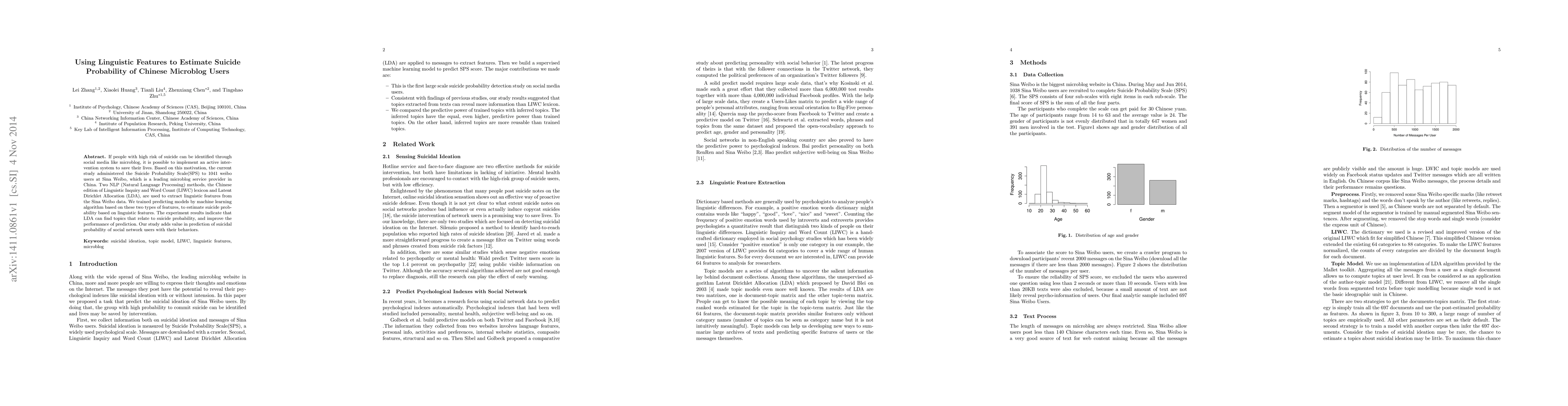 This study uses NLP methods to extract linguistic features from Sina Weibo posts to predict suicide probability among users. LDA was found to improve predictive performance by identifying relevant topics, demonstrating the potential of social media data for suicide risk assessment.