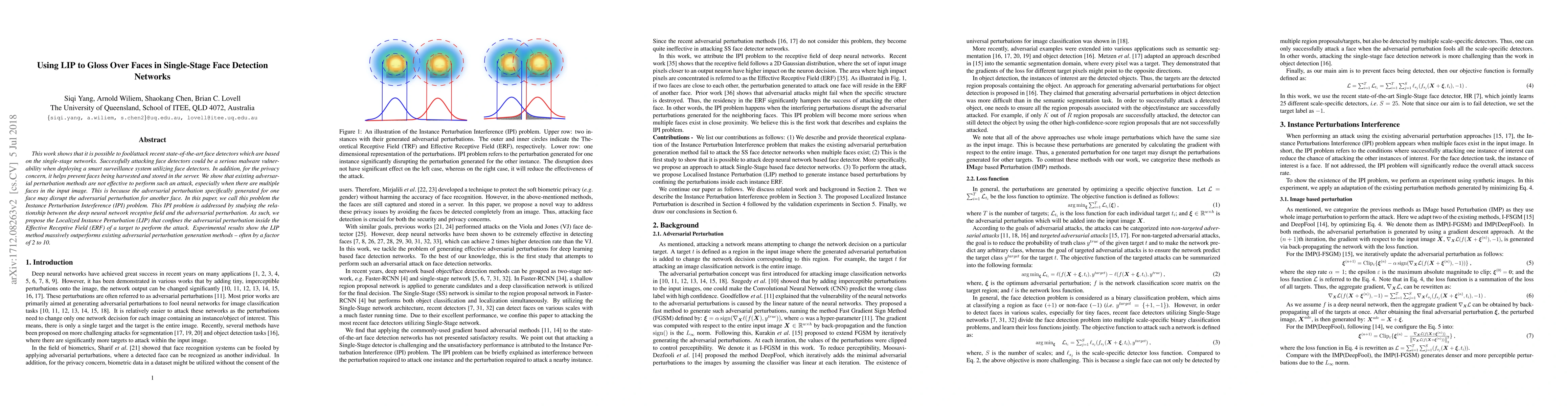 This paper proposes the Localized Instance Perturbation (LIP) method to effectively attack single-stage face detection networks, addressing the Instance Perturbation Interference (IPI) problem. LIP outperforms existing adversarial perturbation methods, especially in scenarios with multiple faces, demonstrating significant improvements in attack efficacy.