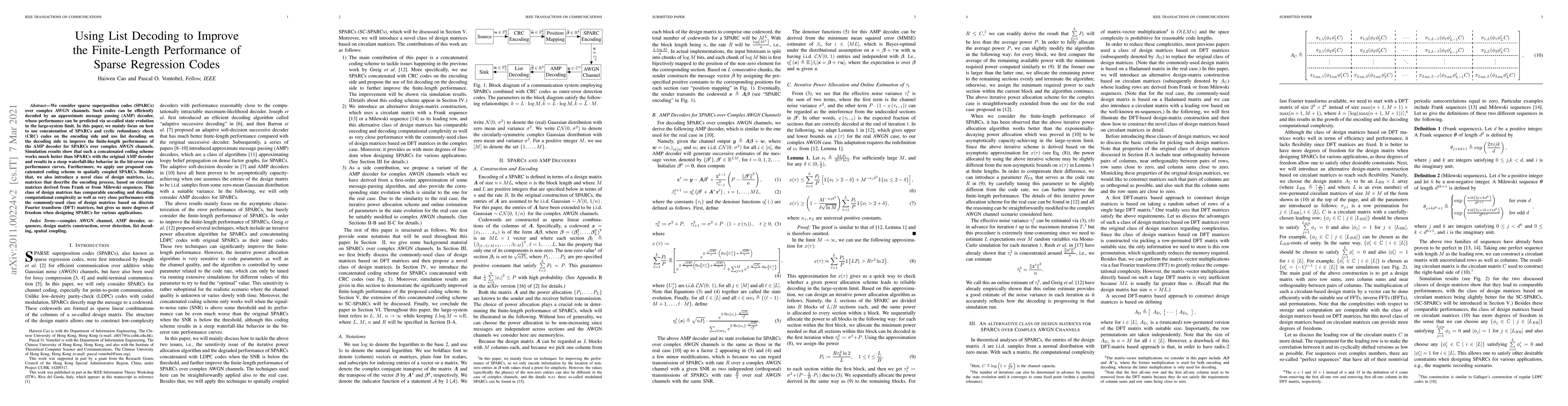 This paper proposes a concatenated coding scheme using sparse regression codes (SPARCs) and cyclic redundancy check (CRC) codes, along with list decoding to enhance the finite-length performance of AMP decoders over complex AWGN channels. The results show significant improvement in bit-error rate performance compared to original SPARCs.
