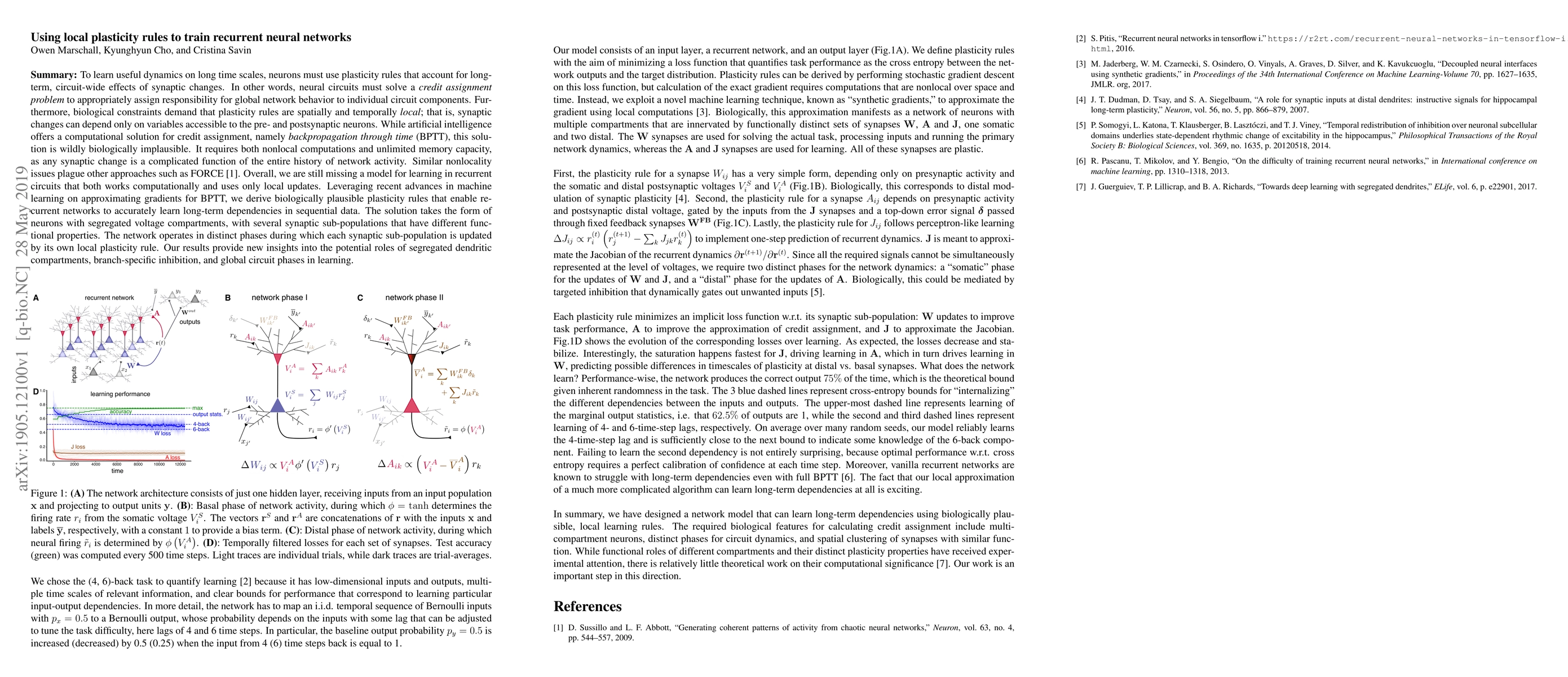 This paper proposes biologically plausible local plasticity rules for training recurrent neural networks to learn long-term dependencies, addressing the limitations of nonlocal methods like backpropagation through time. It introduces segregated voltage compartments and distinct synaptic sub-populations with unique local rules, offering insights into dendritic compartments and global circuit phases.