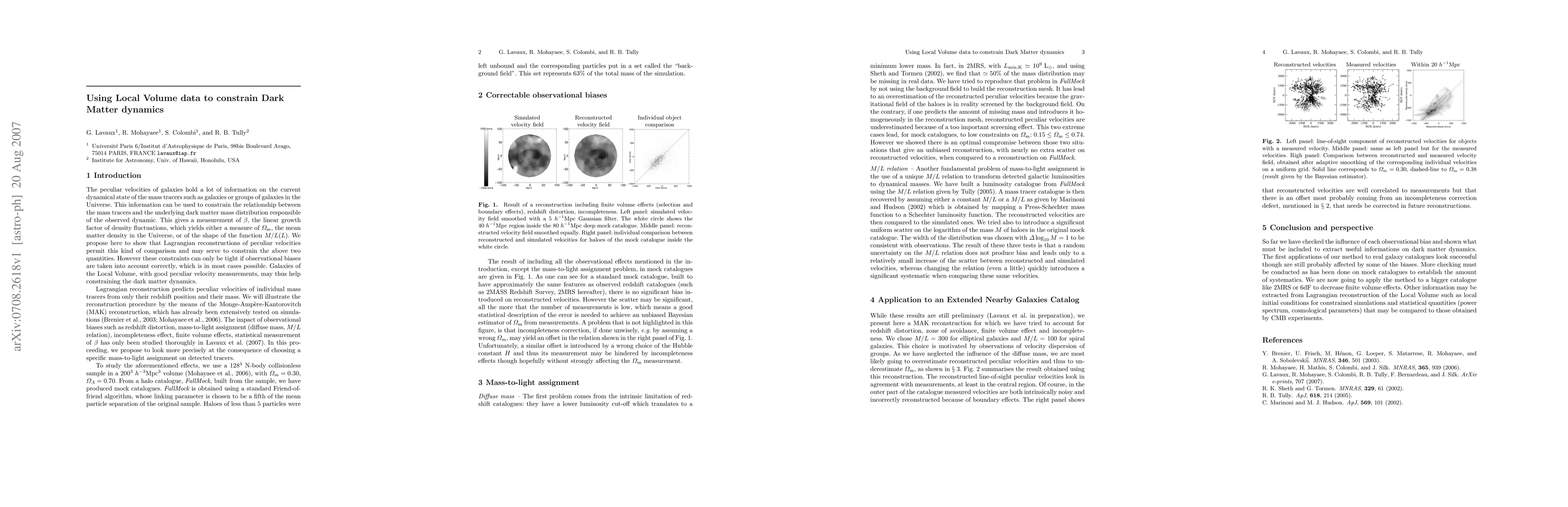 The peculiar velocity reconstruction methods allow one to have a deeper insight into the distribution of dark matter: both to measure mean matter density and to obtain the primordial density fluctuations. We present here the Monge-Ampere-Kantorovitch method applied to mock catalogues mimicking in both redshift and distance catalogues. After having discussed the results obtained for a class of biases that may be corrected for, we focus on the systematics coming from the unknown distribution of unobserved mass and from the statistical relationship between mass and luminosity. We then show how to use these systematics to put constraints on the dark matter distribution. Finally a preliminary application to an extended version (c z < 3000 km/s) of the Neighbour Galaxy Catalogue is presented. We recover the peculiar velocities in our neighbourhood and present a preliminary measurement of the local Omega_M.