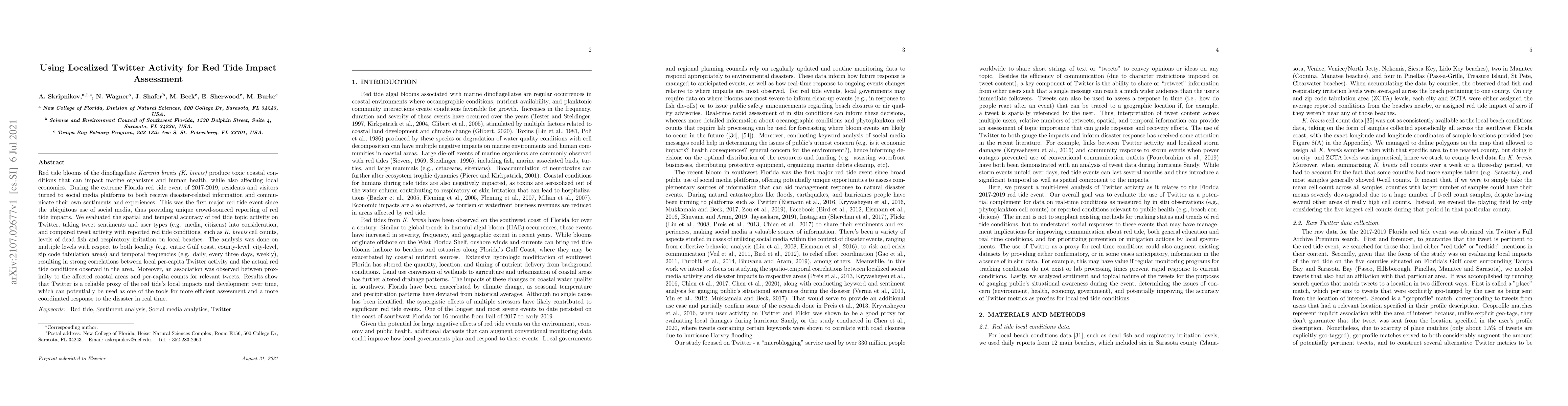 Red tide blooms of the dinoflagellate Karenia brevis (K. brevis) produce toxic coastal conditions that can impact marine organisms and human health, while also affecting local economies. During the extreme Florida red tide event of 2017-2019, residents and visitors turned to social media platforms to both receive disaster-related information and communicate their own sentiments and experiences. This was the first major red tide event since the ubiquitous use of social media, thus providing unique crowd-sourced reporting of red tide impacts. We evaluated the spatial and temporal accuracy of red tide topic activity on Twitter, taking tweet sentiments and user types (e.g. media, citizens) into consideration, and compared tweet activity with reported red tide conditions, such as K. brevis cell counts, levels of dead fish and respiratory irritation on local beaches. The analysis was done on multiple levels with respect to both locality (e.g., entire Gulf coast, county-level, city-level, zip code tabulation areas) and temporal frequencies (e.g. daily, every three days, weekly), resulting in strong correlations between local per-capita Twitter activity and the actual red tide conditions observed in the area. Moreover, an association was observed between proximity to the affected coastal areas and per-capita counts for relevant tweets. Results show that Twitter is a reliable proxy of the red tide's local impacts and development over time, which can potentially be used as one of the tools for more efficient assessment and a more coordinated response to the disaster in real time.