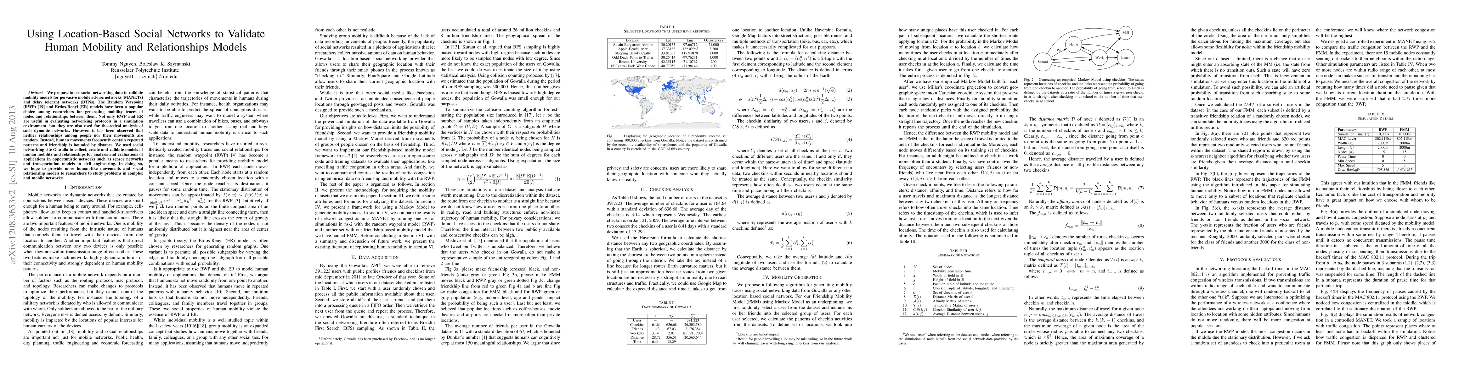 This paper uses data from the social networking site Gowalla to validate existing mobility models for MANETs and DTNs, arguing that traditional models like RWP and ER fail to capture the structured patterns in human movement and social relationships. The study aims to provide more realistic models for evaluating applications in dynamic and mobile networks.