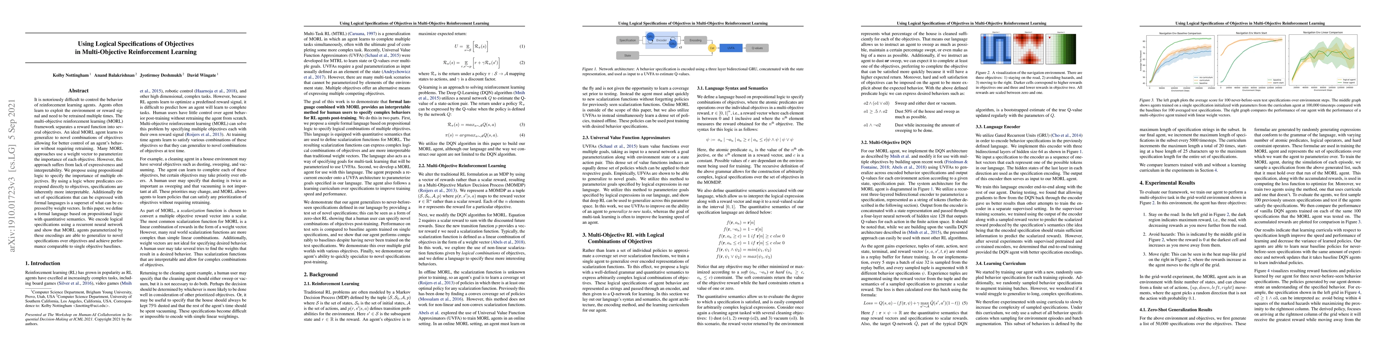 This paper proposes using logical specifications based on propositional logic to improve the control and interpretability of multi-objective reinforcement learning (MORL) agents, demonstrating that agents trained with these logical encodings can generalize to novel objectives effectively.