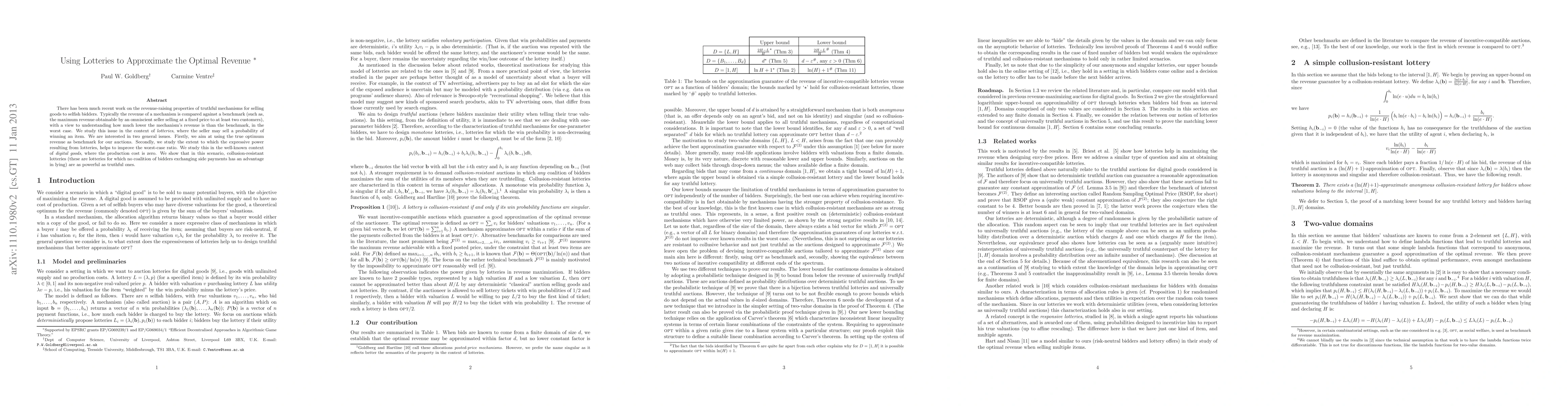 Research uses lotteries to approximate optimal revenue in auctions, finding that collusion-resistant lotteries can match the power of truthful ones for digital goods with zero production costs.