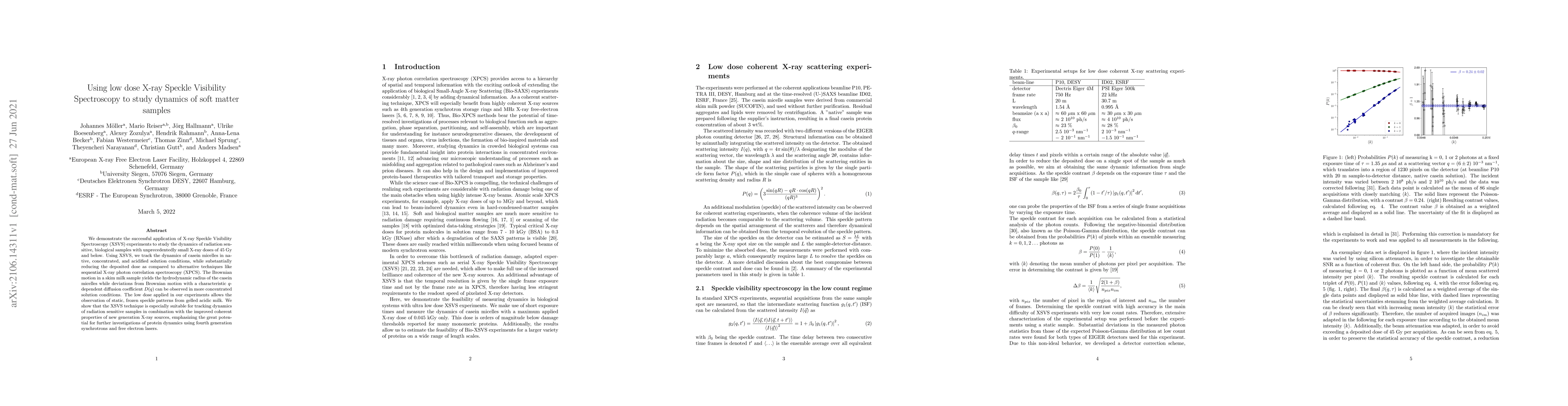 This paper demonstrates the use of low-dose X-ray Speckle Visibility Spectroscopy (XSVS) to study the dynamics of radiation-sensitive biological samples, achieving unprecedentedly small X-ray doses. The technique successfully tracks the dynamics of casein micelles in various milk conditions, revealing insights into their behavior and potential for future studies using advanced X-ray sources.